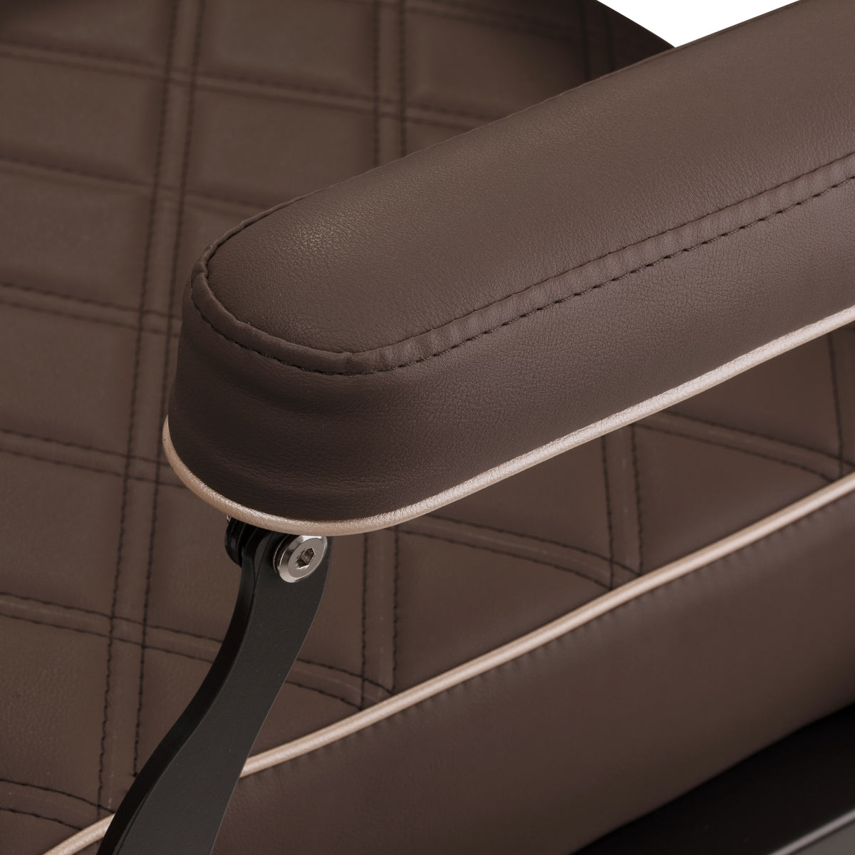 La construction solide assure la stabilité et un grand confort d'utilisation. L'assise est remplie de mousse résistante à la déformation, et le revêtement en cuir synthétique doux et mat confère au mobilier durabilité et confort. Les matériaux résistants à l'humidité sont non seulement durables mais aussi faciles à nettoyer. La teinte brune du revêtement donne à la chaise un caractère unique, et son style élégant s'intègre parfaitement dans tout décor de salon de coiffure.