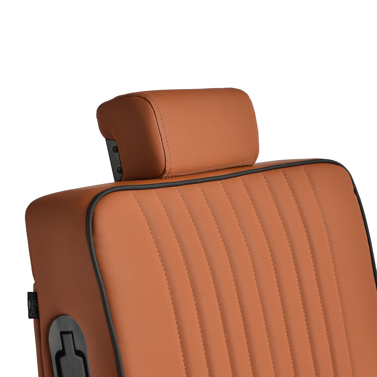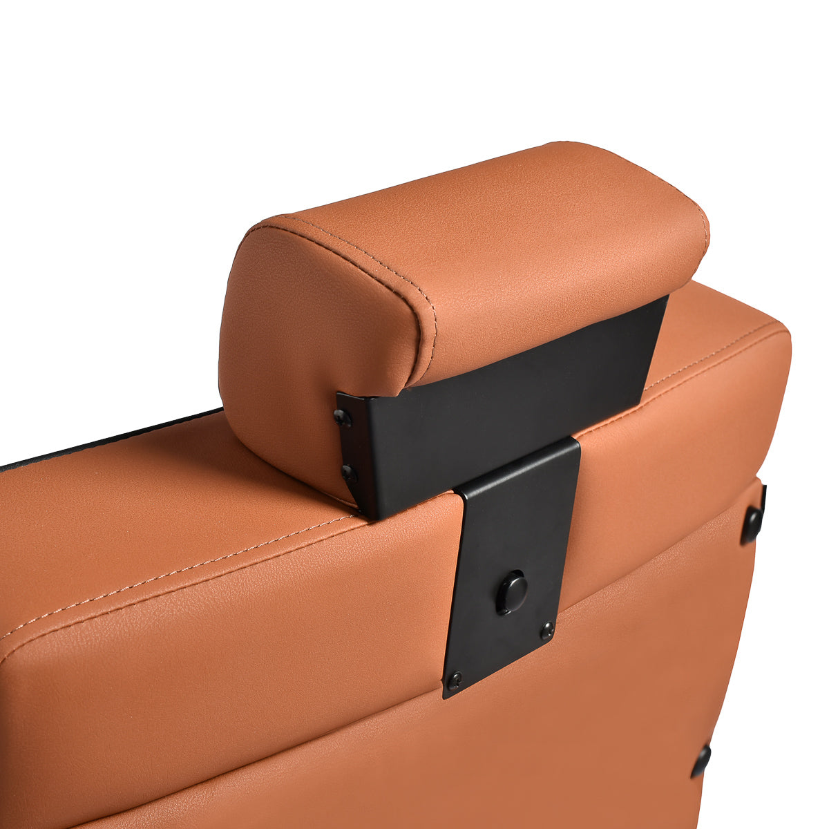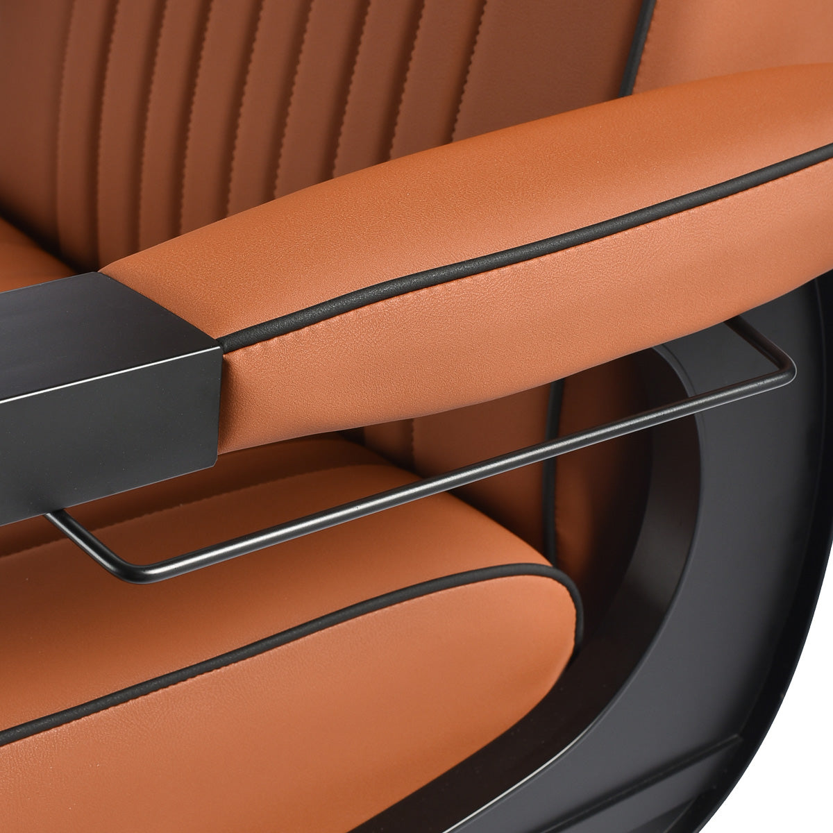 La base noire et ronde assure stabilité et durabilité. Le revêtement en cuir synthétique mat et doux allie confort et robustesse. Les matériaux utilisés sont résistants à l'humidité, durables et faciles à nettoyer. Une couture élégante et un revêtement aux tons bruns lui confèrent un caractère unique, complétant parfaitement la décoration des salons de coiffure modernes. L'association de la couleur élégante du revêtement avec le cadre et la base noirs met en valeur le look moderne et professionnel du fauteuil.