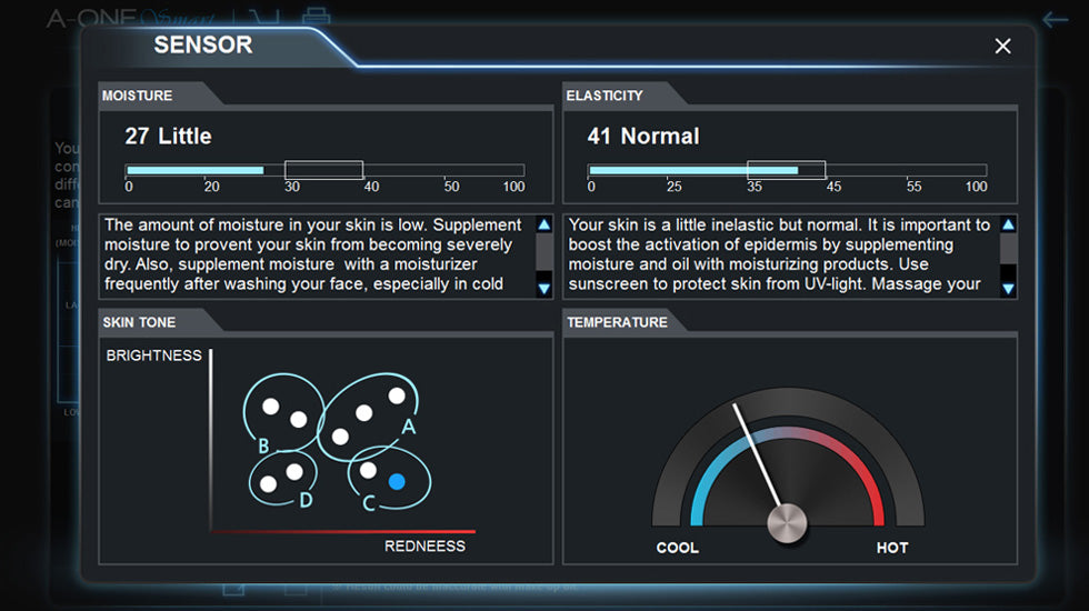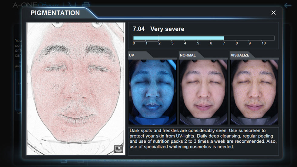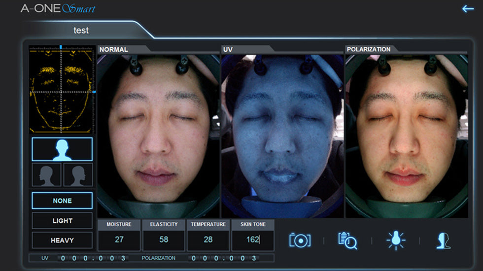 Avec une opération en un clic, A-ONE Smart offre une analyse complète du visage utilisant la reconnaissance faciale IA brevetée, un éclairage multispectre (Normal, UV et Polarisé), et une imagerie haute résolution. Ce système puissant mesure huit indicateurs clés de la peau — taille des pores, sébum, rides, pigmentation, teint de la peau, température, hydratation et élasticité — permettant des évaluations précises en temps réel.