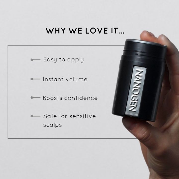 Disponible en 10 teintes naturelles, les fibres Nanogen se fondent parfaitement avec vos cheveux pour un rendu indétectable. Elles sont testées dermatologiquement, sûres pour les cuirs chevelus sensibles, et ne bouchent pas les pores ni n'interfèrent avec les traitements topiques comme le Minoxidil.