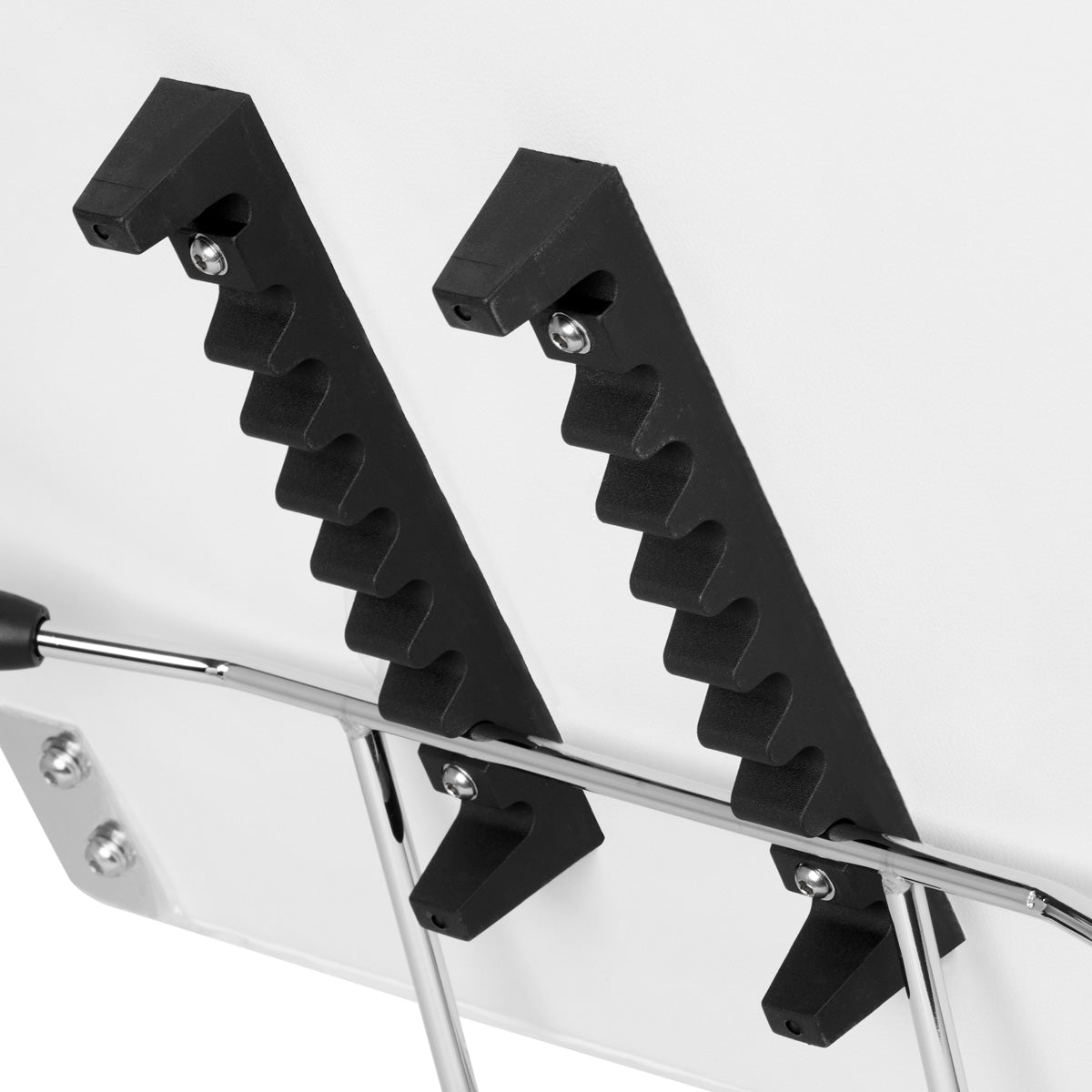 L'ajustement progressif des angles auxquels sont situés le repose-pieds et le dossier est assuré par un mécanisme spécial. À l'aide d'un levier manuel, vous pouvez régler en douceur la position de la chaise. Cela permet un ajustement optimal aux besoins individuels, pour une réalisation correcte et confortable des soins et un grand confort d'utilisation. La chaise peut être dépliée jusqu'à la position inclinée, ce qui augmente considérablement sa fonctionnalité. Cela vous permet d'effectuer librement divers types de soins dans des domaines tels que la cosmétique, la physiothérapie ou le tatouage.