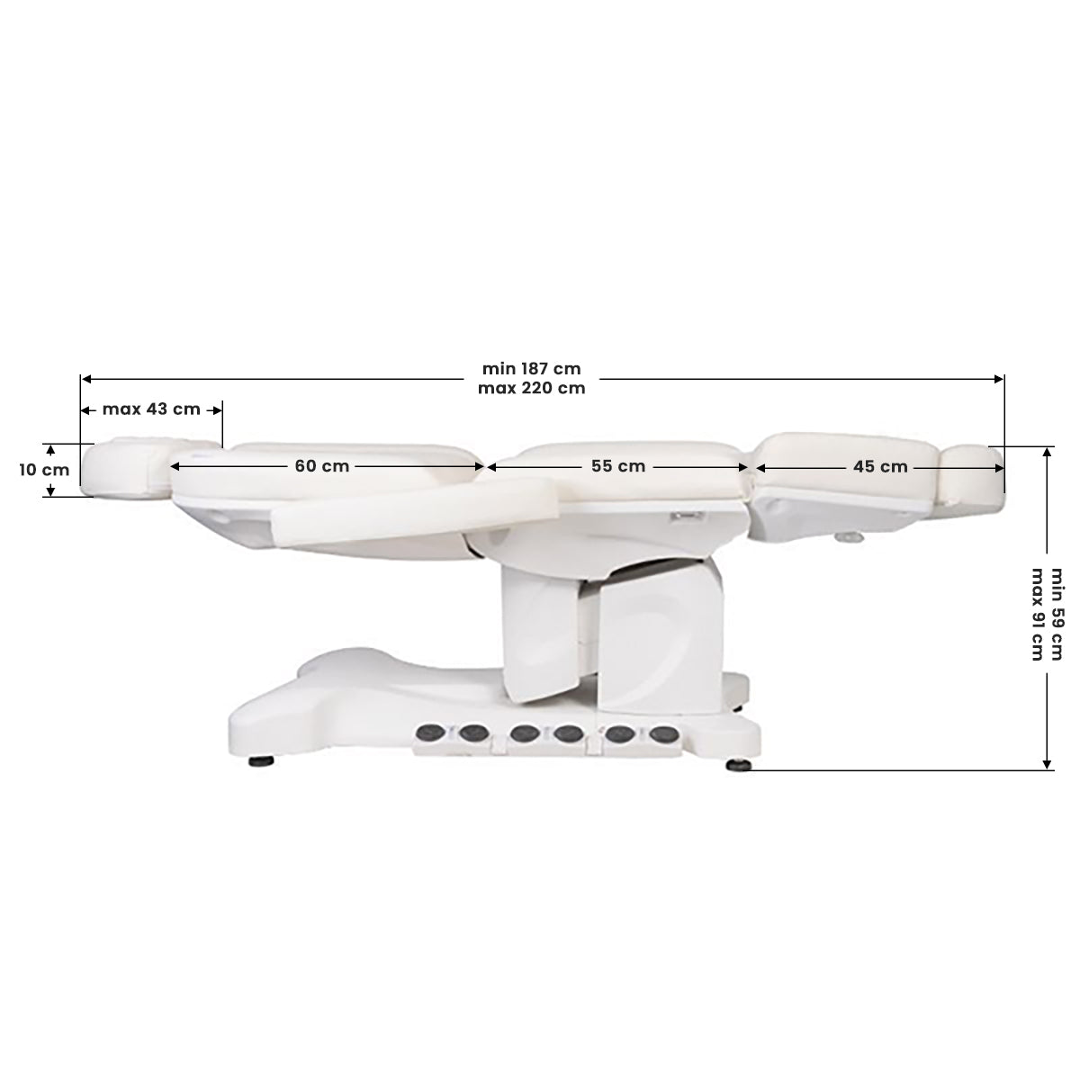 Un fauteuil cosmétique électrique unique, idéalement adapté aux salons de beauté et aux spas. Grâce à des moteurs indépendants, il permet de régler le fauteuil sur 4 plans au moyen d'une télécommande et de pédales, offrant la possibilité de traitements confortables du visage et du corps. En utilisant la télécommande, nous pouvons utiliser les réglages programmés et démarrer la fonction CHAUFFAGE, c’est-à-dire le chauffage. Le fauteuil utilise un rembourrage perforé, inédit dans d'autres fauteuils, et une illumination LED colorée de la base.