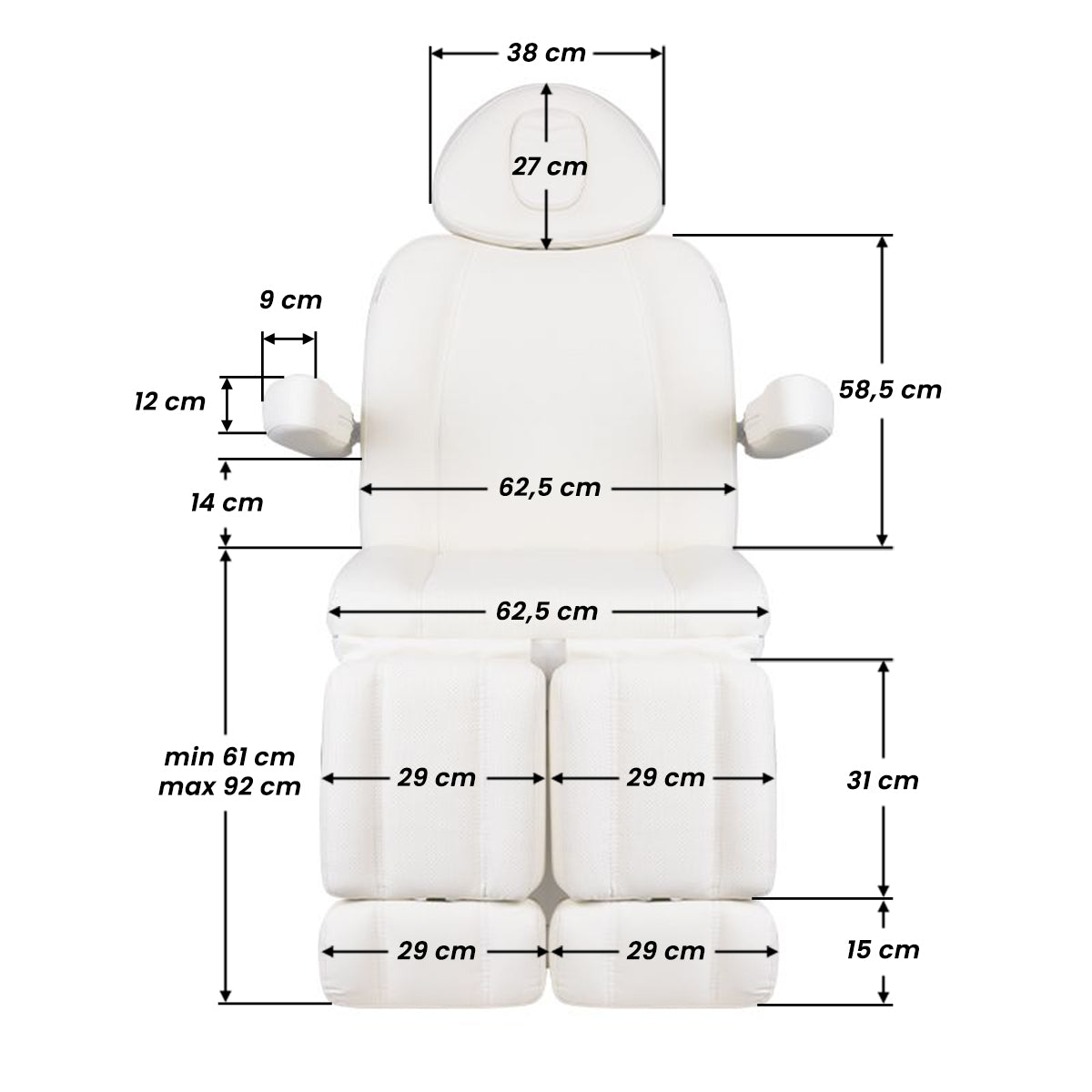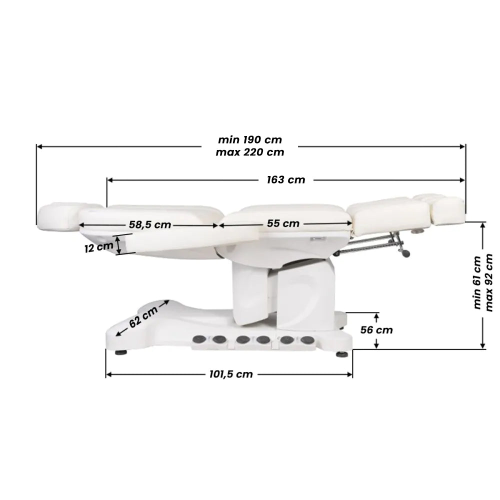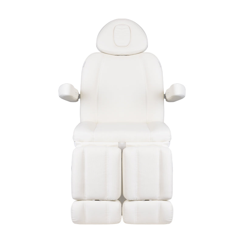 Un fauteuil cosmétique électrique unique, idéalement adapté aux salons de beauté et aux spas. Grâce à des actionneurs indépendants, il permet de régler le fauteuil sur 3 plans au moyen d'une télécommande et de pédales, offrant la possibilité de traitements de pédicure confortables ainsi que des soins du visage et du corps. En utilisant la télécommande, nous pouvons utiliser les réglages programmés et activer la fonction CHAUFFAGE, c’est-à-dire le chauffage. Le fauteuil utilise un rembourrage perforé, inédit dans d'autres fauteuils, et une illumination LED colorée de la base.