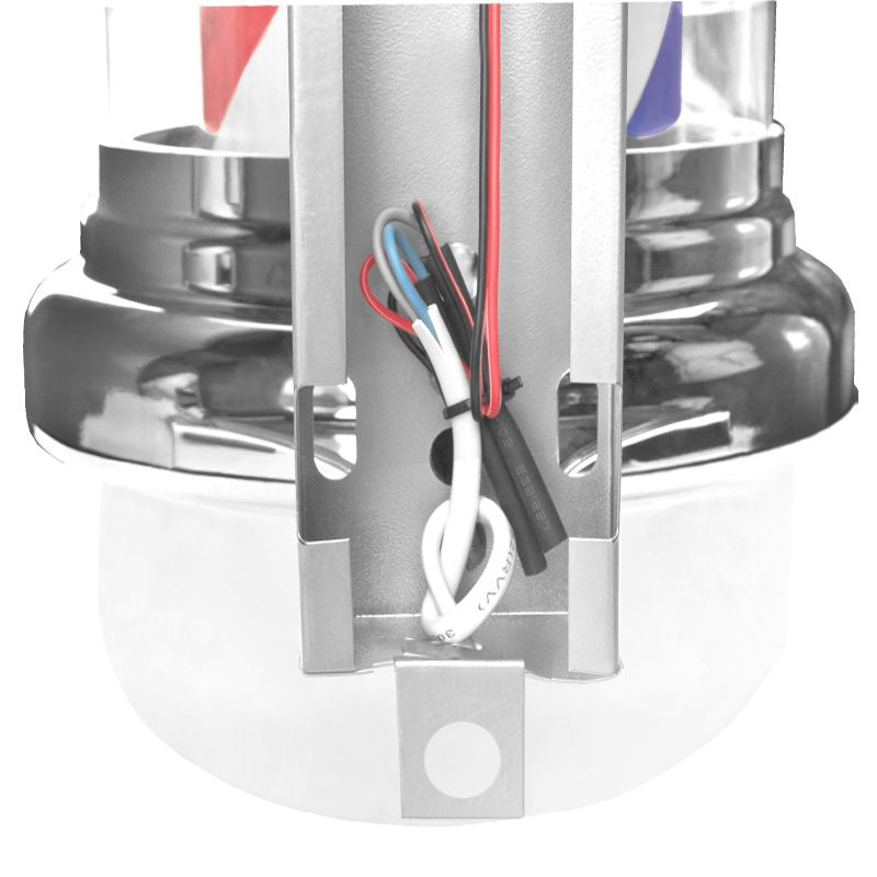 Un plafond illuminé accrocheur, équipé d'un cylindre rotatif, est une excellente publicité pour un salon de coiffure. Le design distinctif, avec des éléments rotatifs en rouge, blanc et bleu, crée une carte de visite unique et comprise internationalement du salon de coiffure. En utilisant la télécommande filaire, vous pouvez allumer à la fois l'éclairage et la rotation du plafond.