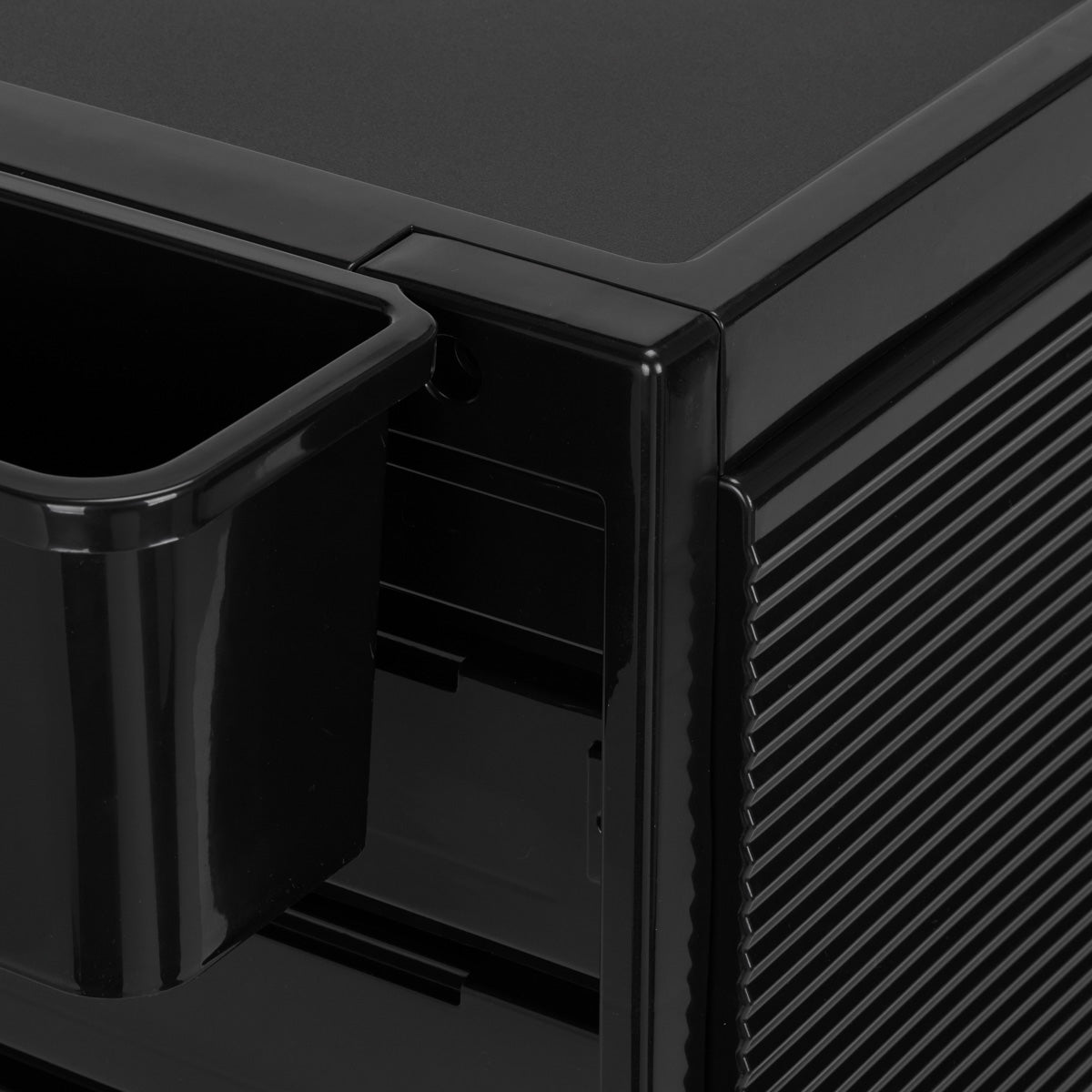 L'organisateur spacieux est équipé d'un ensemble de plateaux de rangement qui aidera à assurer l'ordre sur le lieu de travail, en triant les outils nécessaires au travail du coiffeur. L'ensemble comprend six contenants : deux sans compartiments, deux avec compartiments et deux étroits et plus profonds. Leur disposition dans l'organisateur peut être librement modifiée à volonté pour s'adapter à vos propres besoins, et une large sélection de différents types de tiroirs vous permet de trier les ustensiles à votre discrétion. De plus, les deux cuvettes les plus profondes peuvent être placées à différentes hauteurs sur les côtés de l'assistant, de sorte que les ustensiles placés dedans seront toujours au bon niveau. Le panneau arrière inclus empêche les tiroirs d'être tirés accidentellement dans l'autre sens, ce qui pourrait endommager les ustensiles à l'intérieur.