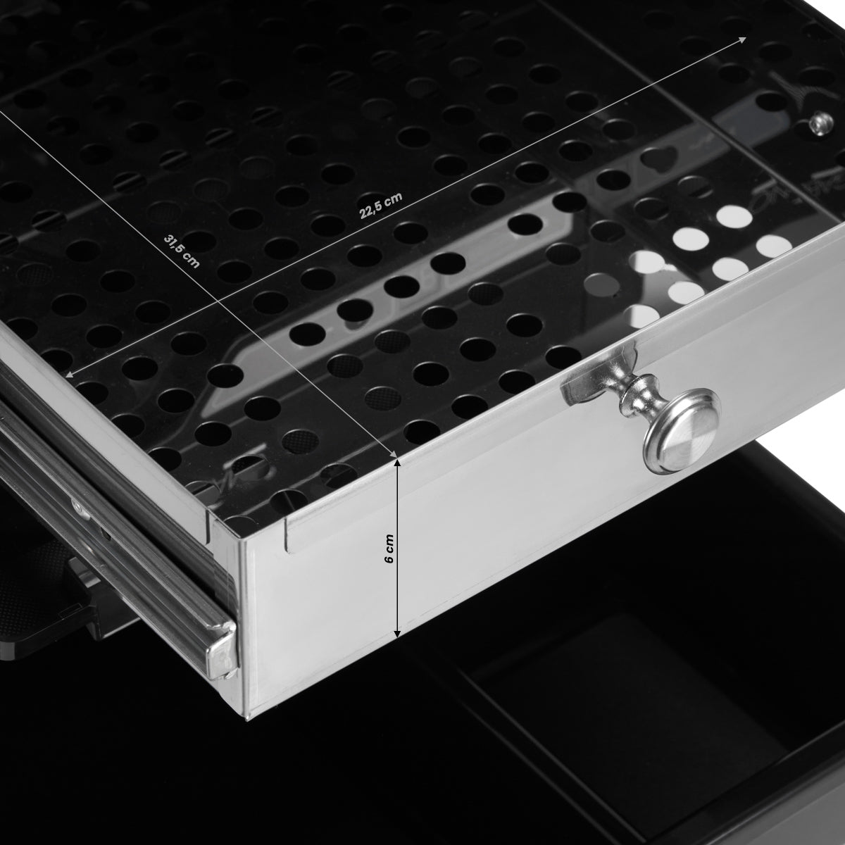 Au sommet de l'aide-coiffeur se trouve une cavité peu profonde, qui sera idéale pour ranger les outils pendant que vous travaillez. Ce sera également un excellent endroit pour poser les accessoires les plus nécessaires pendant la durée du service – comme dans le cas de la coloration – bols, peintures ou pinceaux. La surface de la cavité – comme tous les plateaux de l'ensemble – est recouverte d'une couche mate, rugueuse et antidérapante, grâce à laquelle elle amortit et maintient les instruments placés à leur place.