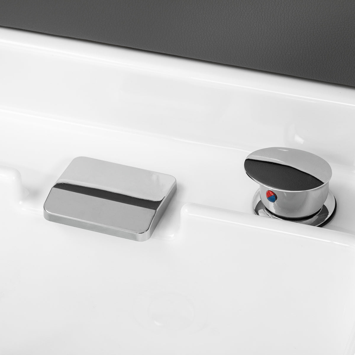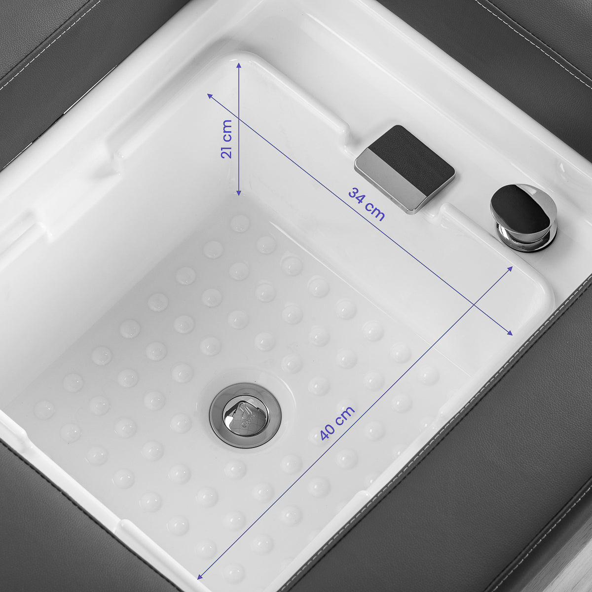 L'unité de lavage est équipée d'un robinet mélangeur, permettant un réglage facile de la température selon les préférences du client. Un emplacement pratique pour la douche facilite le travail, tandis qu'un bouchon avec un filtre spécial permet de contrôler le débit d'eau et de maintenir des normes d'hygiène élevées dans le salon. La connexion d'eau est située à l'intérieur sous la cuvette et à l'arrière sous le bac de douche, cachant esthétiquement l'installation. Le fauteuil ergonomiquement profilé offre confort et soutien adéquat pendant les traitements, et le pouf inclus améliore le confort du personnel. L'association de la fonctionnalité et de la commodité fait de cette station de lavage un équipement polyvalent pour les salons de coiffure et les instituts de SPA.