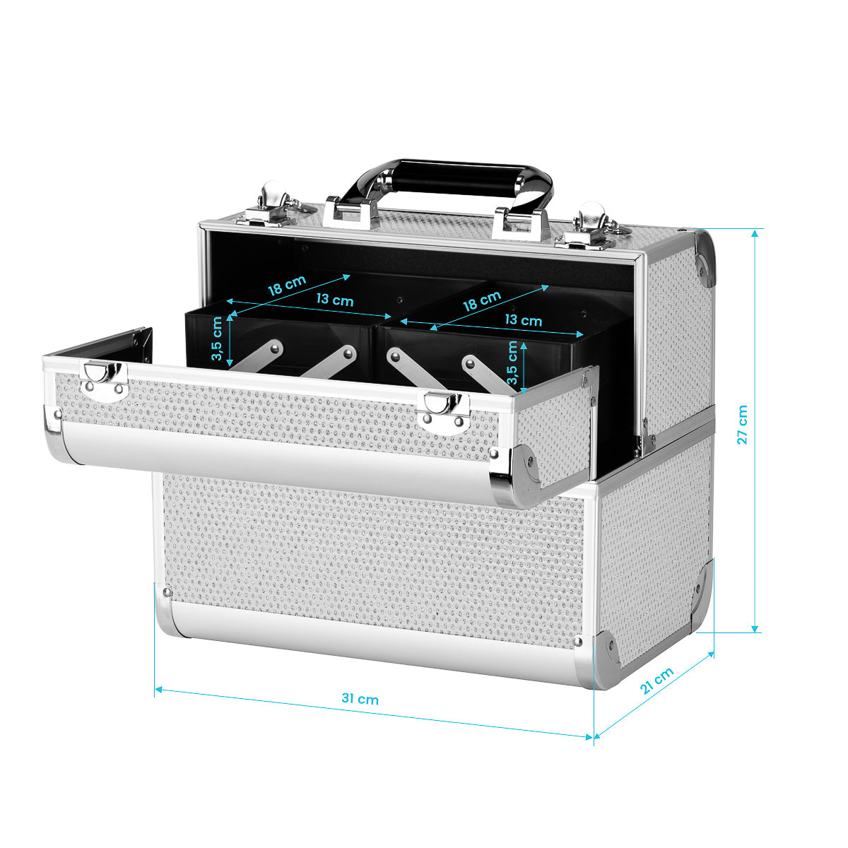 Le design moderne dans des tons argentés avec des accents pailletés ajoute une touche élégante. La poignée facilite le transport, ce qui est particulièrement important pour les stylistes mobiles. Fabriquée en matériaux durables et résistants aux dommages, elle assure le confort d'une utilisation quotidienne. Une fermeture à loquet solide avec clé protège le contenu et la construction légère et durable rend la trousse facile à transporter.