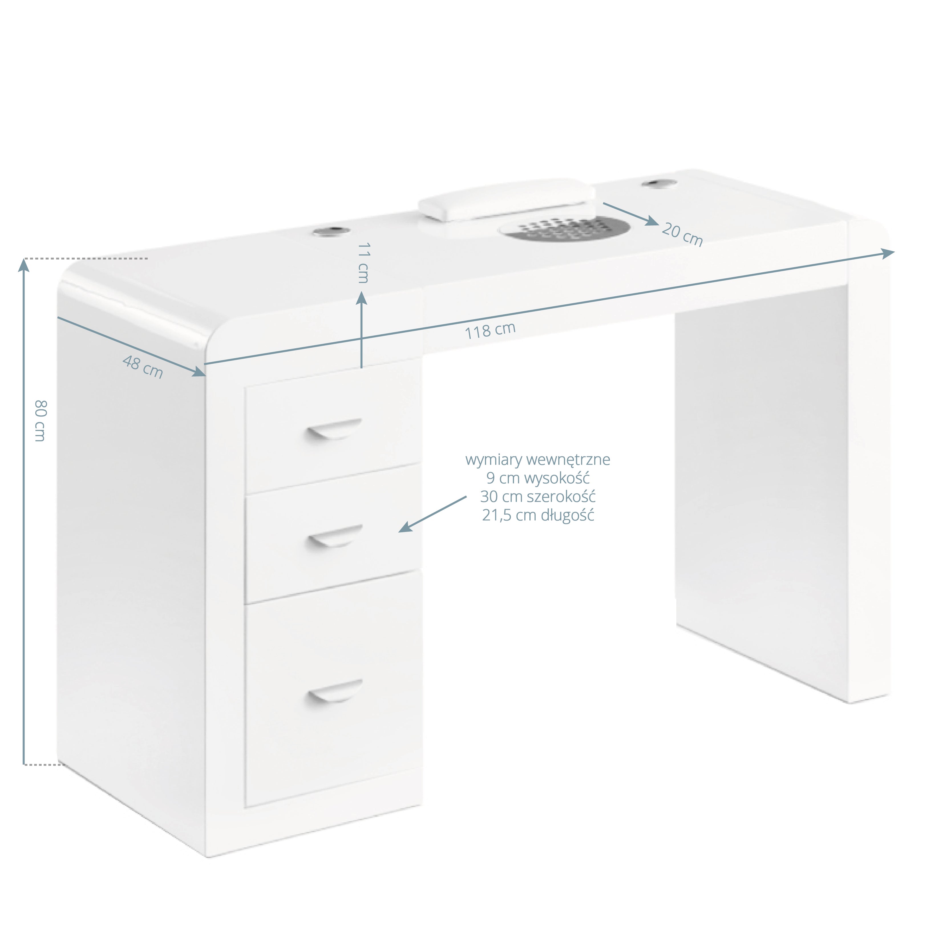 Trois tiroirs spacieux facilitent l'organisation et le rangement des cosmétiques et outils les plus nécessaires. Le bureau est équipé d'un absorbeur pratique qui réduit efficacement la quantité de poussière nocive, assurant un air propre et frais sur le lieu de travail. En même temps, grâce à son intégration dans le plateau, il ne prend pas d'espace de travail précieux. Des emplacements spécialement conçus pour les câbles facilitent l'organisation des appareils nécessaires dans le salon, tels que les perceuses à ongles, lampes de traitement ou lampes à ongles, permettant de cacher les câbles.