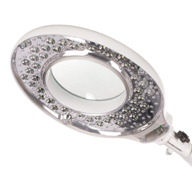Lampe grossissante facile à déplacer et à régler, équipée d'un verre réfractif de haute qualité et d'un système d'éclairage intégré, permettant un diagnostic optimal de la peau. La tête de la lampe est montée sur un bras articulé facilitant son réglage à une distance et une hauteur précises. Facilite le travail lors des soins cosmétiques.