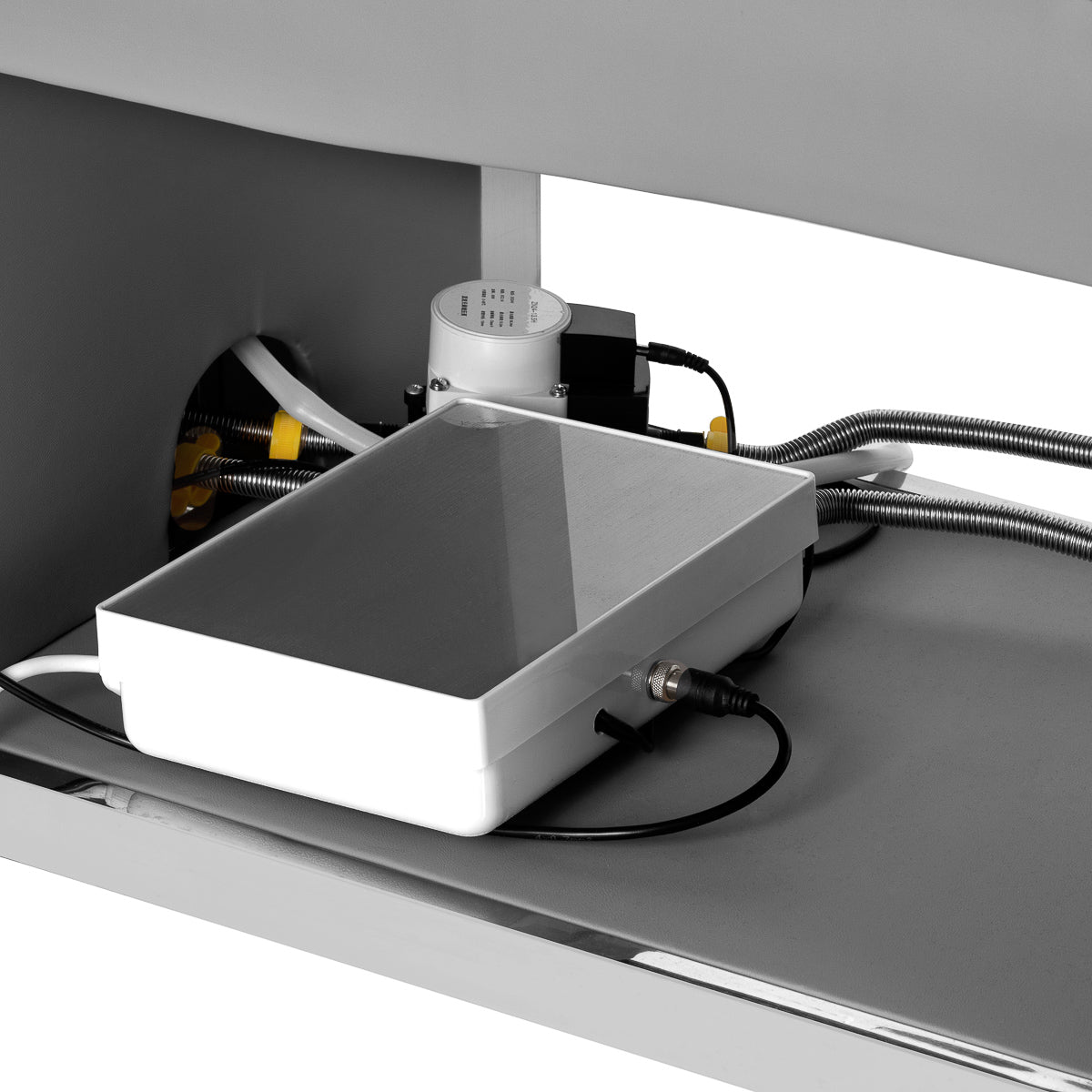 L'unité de lavage des cheveux est équipée d'un robinet mélangeur, qui permet un réglage facile de la température selon les préférences du client. Un emplacement dédié pour la douchette facilite le travail, et un bouchon chromé avec un filtre spécial permet de contrôler le débit d'eau et de maintenir des normes d'hygiène élevées dans le salon. La connexion d'eau est placée à l'intérieur de la base, ce qui permet de cacher efficacement tous les tuyaux. Le fauteuil est profilé de manière à offrir du confort lors de divers traitements. La combinaison de fonctionnalité et d'équipements rend le travail dans un salon de coiffure ou un SPA encore plus confortable. L'ensemble comprend également un pouf confortable, qui assure le confort du personnel, faisant du lit de lavage un solution encore plus polyvalente pour les salons SPA.