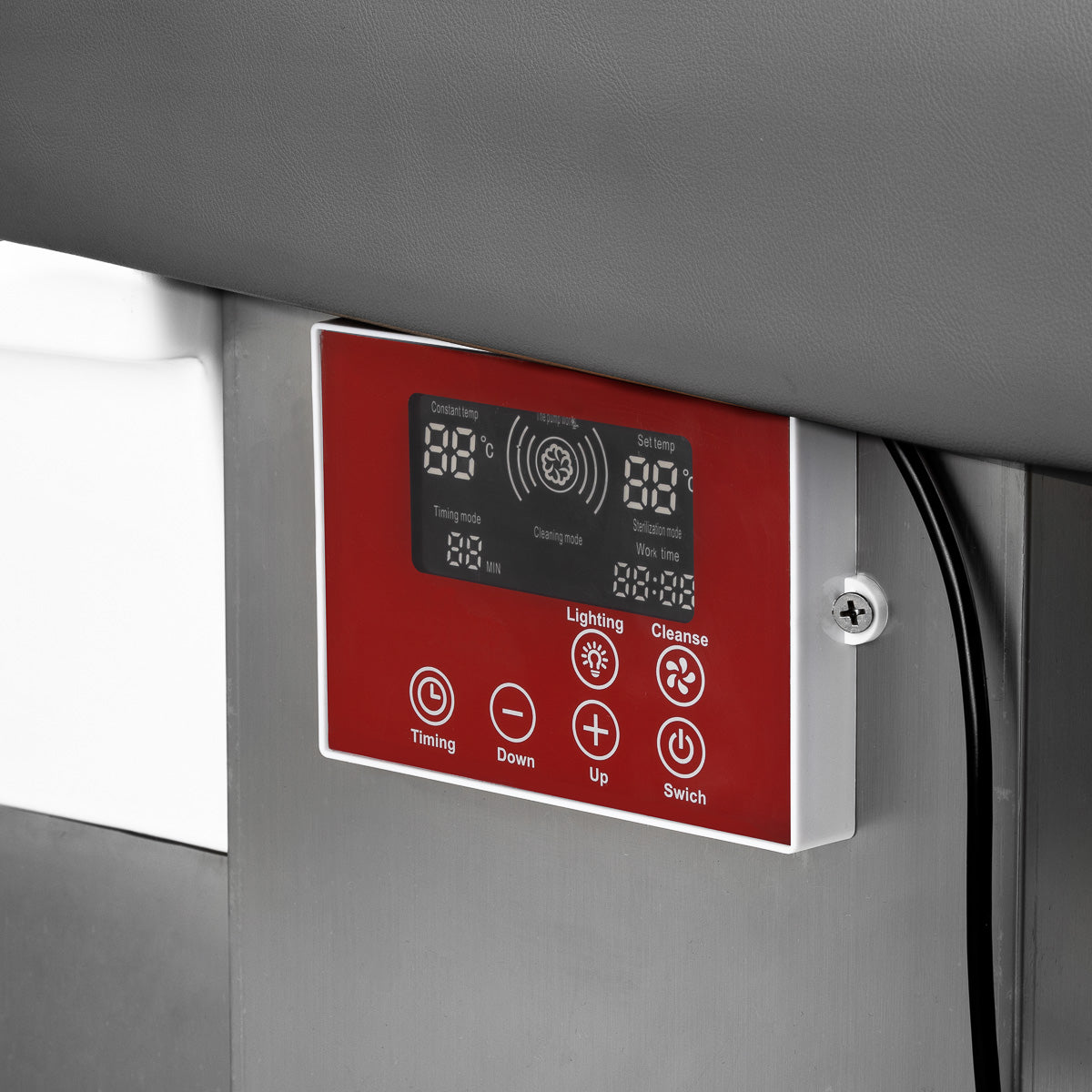 Le panneau tactile intuitif offre un contrôle total des fonctions de l'unité de lavage. Il permet de régler le temps de fonctionnement et la température de l'eau, ainsi que de surveiller leurs valeurs actuelles. Grâce à l'écran intégré, vous pouvez vérifier à tout moment la durée de fonctionnement de l'appareil. Le panneau permet également d'activer la fonction de luminothérapie, c'est-à-dire l'illumination de la cuvette, créant une atmosphère de relaxation et de luxe. De plus, l'appareil de thérapie à la vapeur est équipé d'une télécommande, permettant une utilisation à distance pratique.