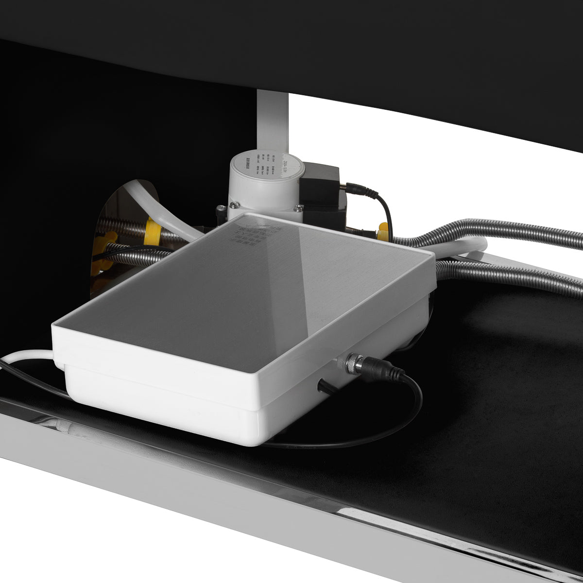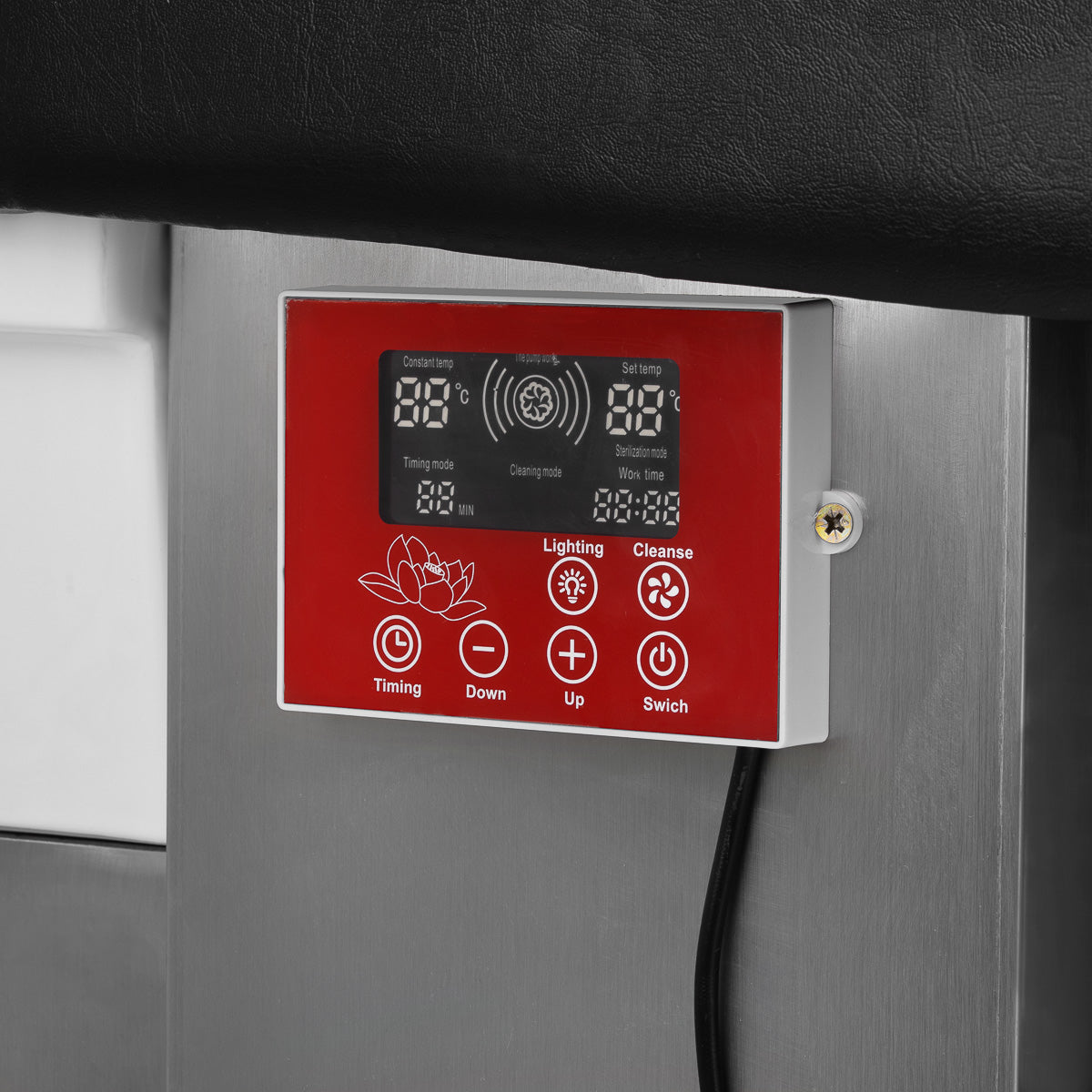 Le panneau tactile intuitif offre un contrôle complet des fonctions de l'unité de lavage. Il permet d'ajuster le temps de fonctionnement et la température de l'eau, ainsi que de surveiller leurs valeurs actuelles. Grâce à l'écran intégré, vous pouvez vérifier à tout moment la durée de fonctionnement de l'appareil. Le panneau permet également d'activer la fonction de luminothérapie, c'est-à-dire l'illumination de la cuvette, créant une atmosphère de relaxation et de luxe. De plus, l'appareil de thérapie à la vapeur est équipé d'une télécommande, permettant une utilisation à distance pratique.