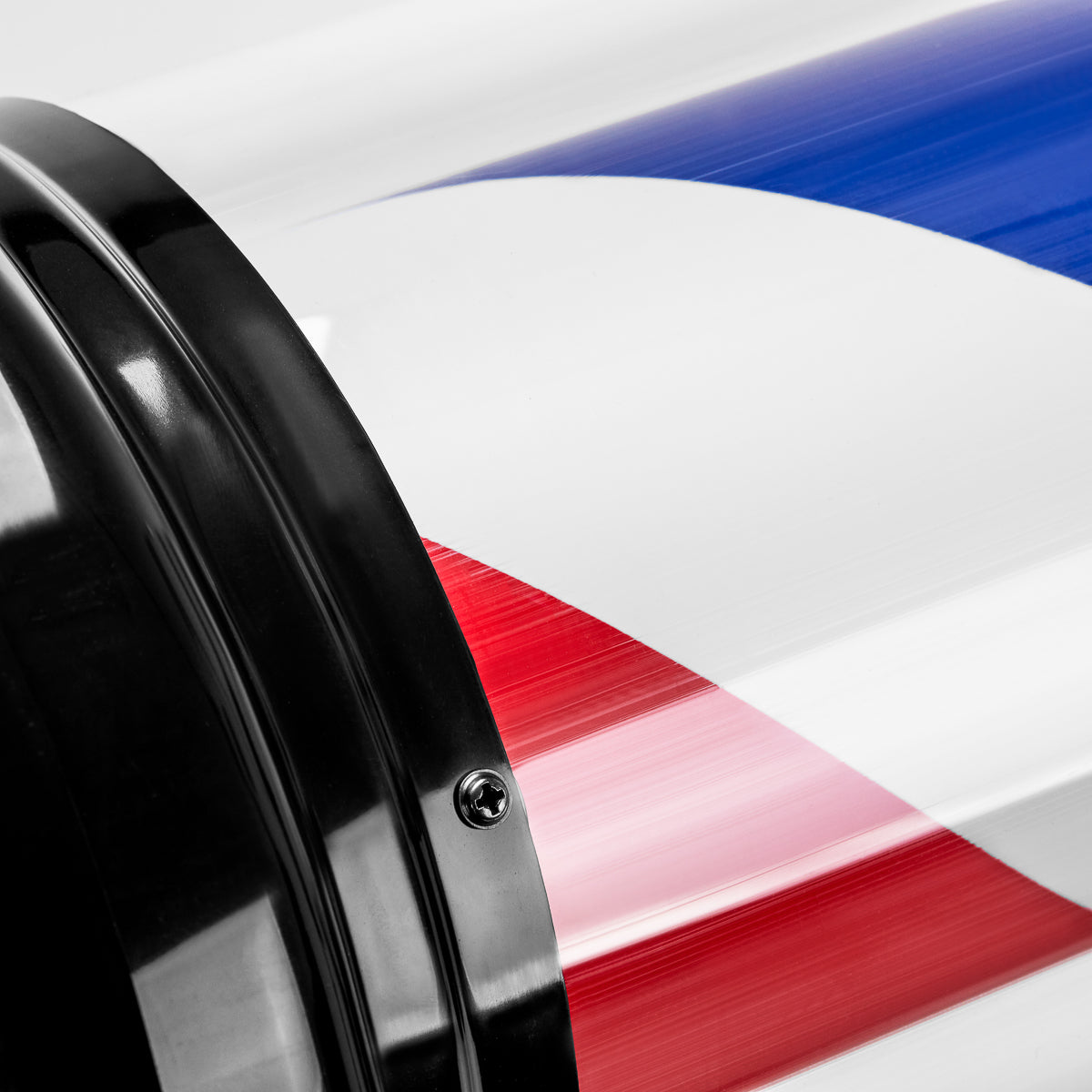 Un plafond illuminé accrocheur, équipé d'un cylindre rotatif, est une excellente publicité pour un salon de coiffure. Le design distinctif, avec des éléments rotatifs en rouge, blanc et bleu, crée une carte de visite unique et comprise internationalement du salon de coiffure. En utilisant la télécommande filaire, vous pouvez allumer à la fois l'éclairage et la rotation du plafond.