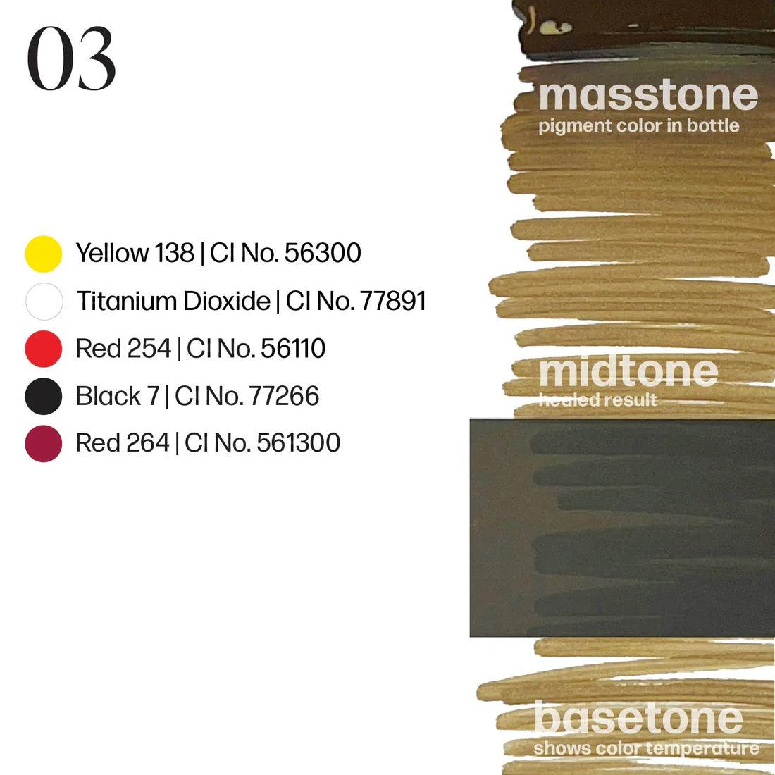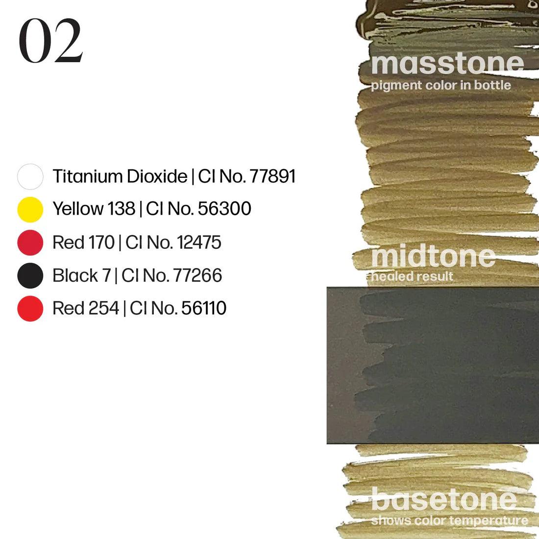 - 02: Une teinte plus foncée et neutre idéale pour les clients aux cheveux blonds avec des sous-tons chauds ou neutres, ou une peau aux tons froids pour un effet plus frais après cicatrisation.
