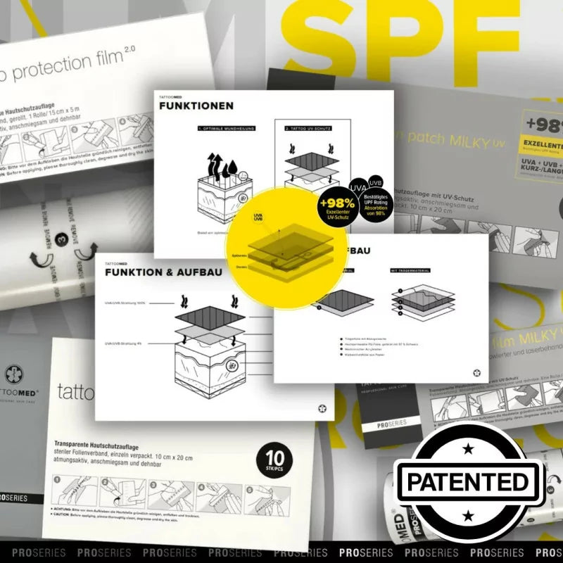Le Patch Film UV de Protection Tatouage TattooMed 10cm x 20cm est une solution brevetée de qualité médicale conçue pour offrir à votre tatouage frais une protection ultime—surtout pendant les mois d'été. Doté de la surface innovante MILKY, ce patch bloque 98 % de tous les rayons UVA et UVB, offrant une excellente protection solaire UPF lorsque votre peau est la plus vulnérable après le tatouage.