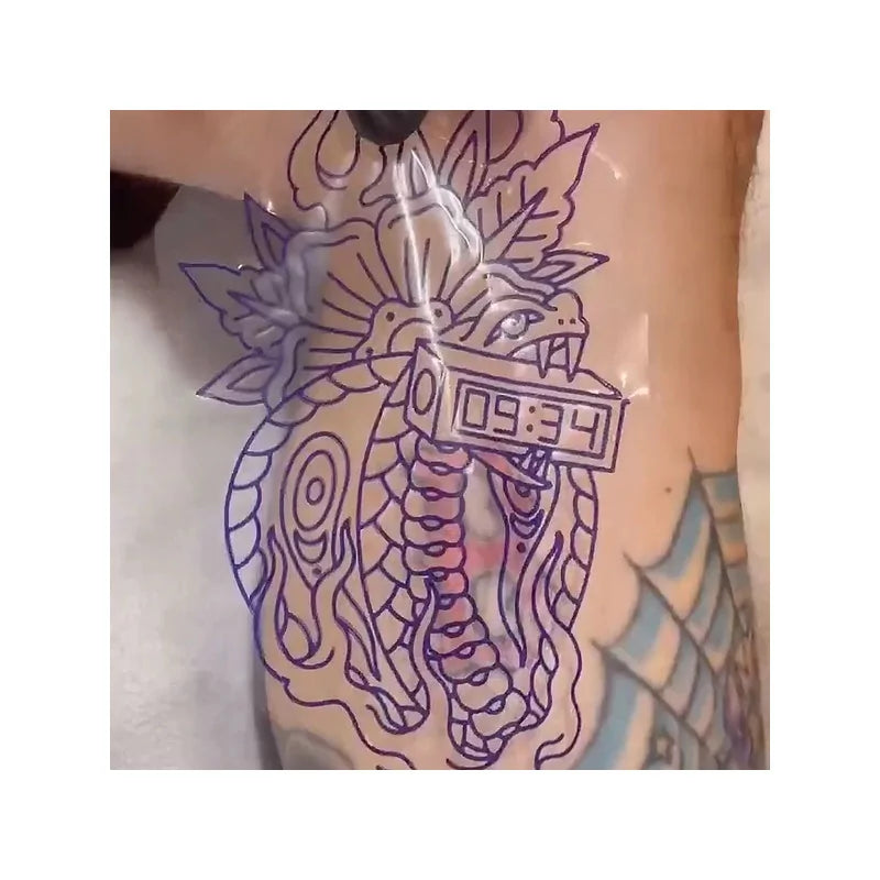 Ce papier pochoir transparent innovant est particulièrement précieux pour les recouvrements, l'intégration de nouveaux dessins dans des tatouages existants et le travail dans des zones étroites ou complexes. La feuille transparente vous permet de positionner votre pochoir en toute confiance, garantissant que votre nouvelle œuvre s'intègre parfaitement au travail précédent dès la première tentative.