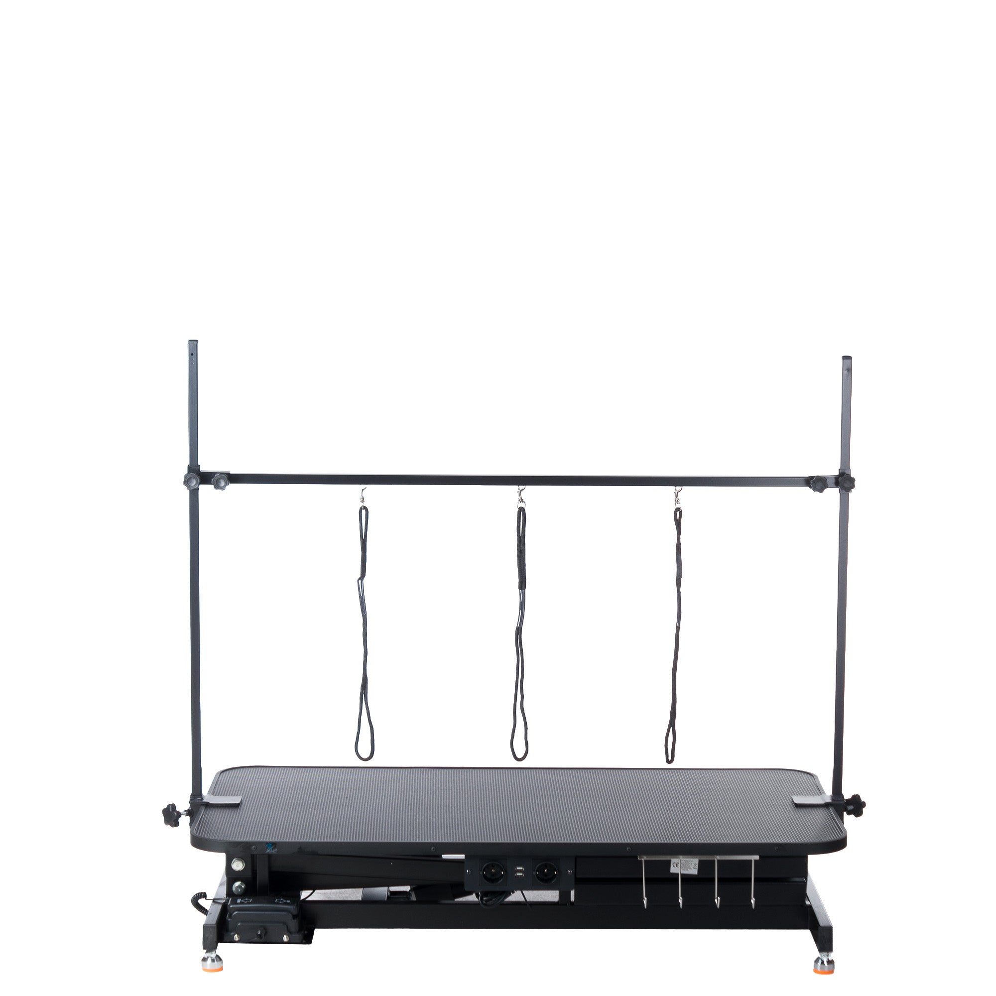 Table de toilettage pour animaux de taille XL. Plateau extrêmement stable recouvert d’un tapis antidérapant de couleur noire. Cadre en acier peint par poudrage en noir. Hauteur du plateau réglable électriquement, ce qui permet d’adapter parfaitement la table à vos besoins ainsi qu’à la taille de votre animal. Inclus une barre transversale réglable en hauteur avec trois laisses.