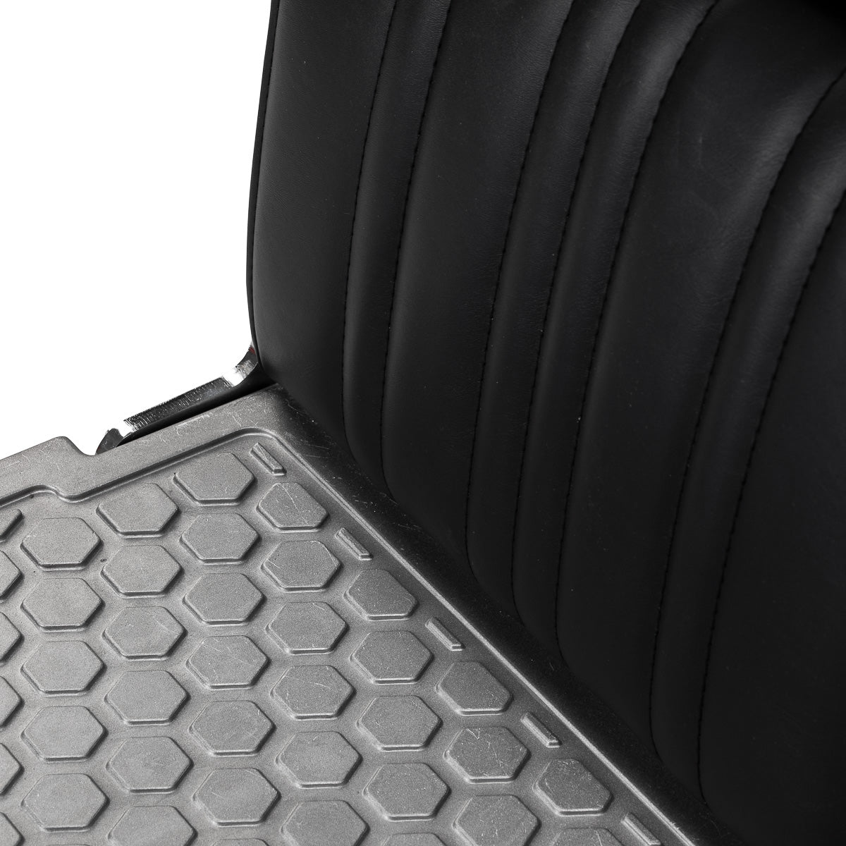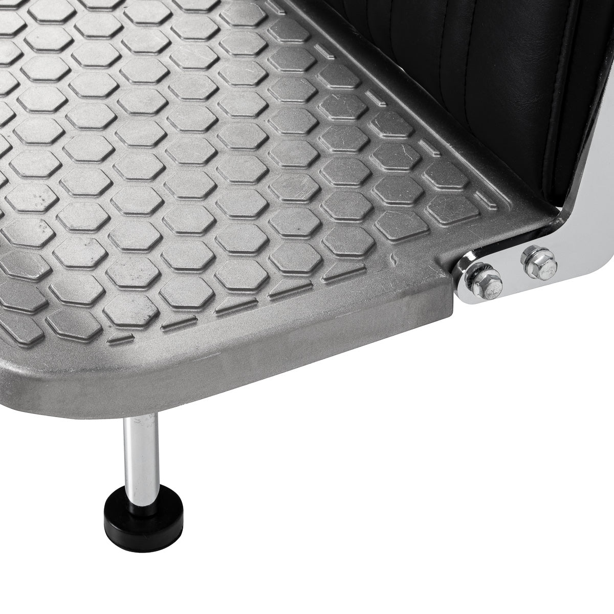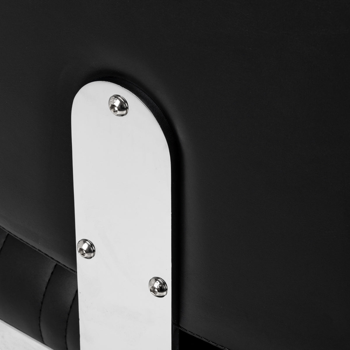 La base stable offre un soutien sécurisé et un grand confort d’utilisation. L’assise est garnie de mousse résistante à la déformation et recouverte de cuir synthétique semi-mat, garantissant durabilité et confort sur le long terme. Les matériaux se distinguent par leur résistance à l’humidité et leur facilité d’entretien. Le revêtement noir associé aux éléments métalliques chromés et au repose-pieds décoratif confèrent au fauteuil un caractère classique et distinctif. Les coutures verticales soulignent le style vintage, qui s’intègre parfaitement à l’atmosphère des barbiers professionnels. Les détails soigneusement travaillés donnent un aspect représentatif à l’ensemble, et le design fonctionnel favorise un travail confortable et efficace.