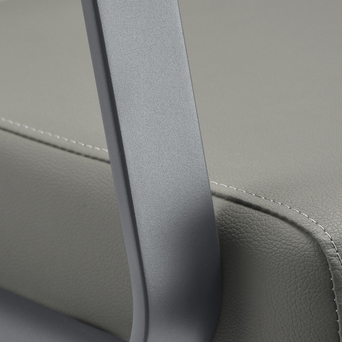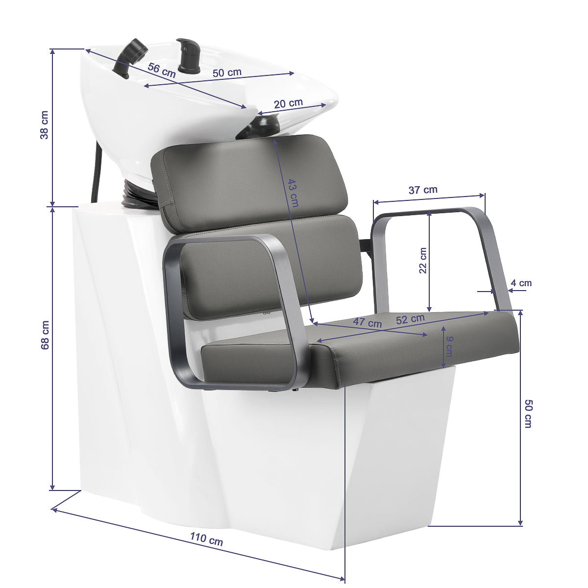 Le fauteuil profilé offre un soutien lombaire adéquat et, par conséquent, un grand confort d'utilisation. Les accoudoirs métalliques dans des tons de gris avec une forme géométrique permettent le positionnement correct des épaules du client. Le rembourrage en mousse durable et résistante à la déformation ainsi que le revêtement en cuir synthétique agréable au toucher dans des tons de gris assurent la durabilité du mobilier, la facilité de nettoyage et un usage confortable sur le long terme. L'apparence originale et élégante de l'unité de lavage donne une expression unique à l'intérieur. L'ensemble comprend des accessoires complets dans des tons de noir, incluant un robinet, une douchette et des tuyaux dédiés pour fournir un ensemble complet d'outils pour le travail.