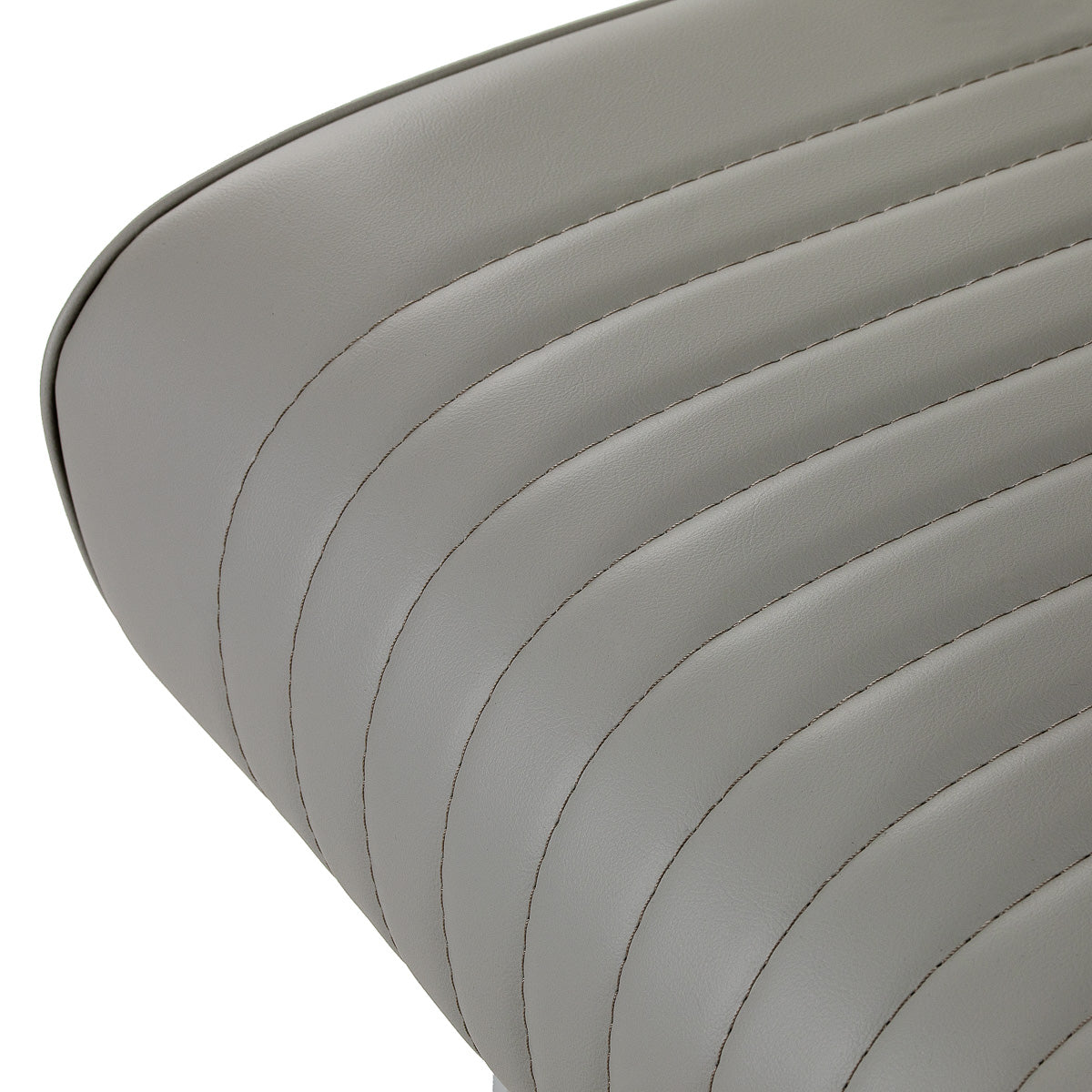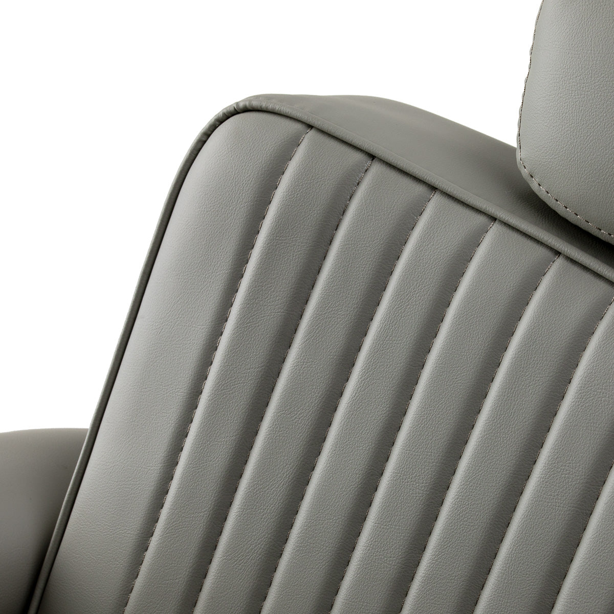 La construction robuste de la base assure stabilité et grand confort. L’assise est garnie de mousse résistante à la déformation et recouverte d’un cuir synthétique doux et mat, allant de la durabilité au confort. Les matériaux utilisés pour la finition sont résistants à l’humidité, durables et faciles à nettoyer, ce qui rend le fauteuil parfait pour un usage quotidien. Les coutures élégantes et le revêtement dans des tons de gris lui confèrent un caractère unique, s’intégrant parfaitement à la décoration des barbiers modernes.