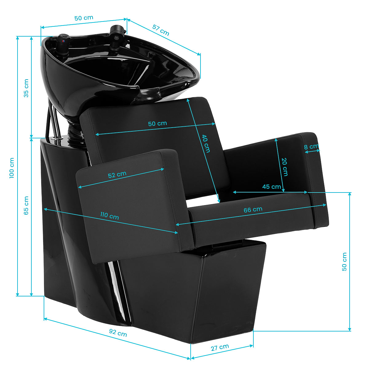 Le fauteuil à la forme géométrique allie simplicité moderne et confort d’usage. L’assise et les accoudoirs aux angles doux forment un ensemble harmonieux, assurant une position confortable pendant les soins, tandis que le dossier à l’angle d’inclinaison optimal favorise une posture correcte et la détente. Le revêtement en cuir synthétique de haute qualité, décliné en nuances de noir, est résistant à l’usure et à l’humidité, ainsi que facile à entretenir. La forme simple et moderne du mobilier met en valeur le caractère élégant du bac à shampoing, et les accessoires complets – mitigeur, douchette et tuyaux dédiés – offrent un ensemble complet d’outils pour le travail.