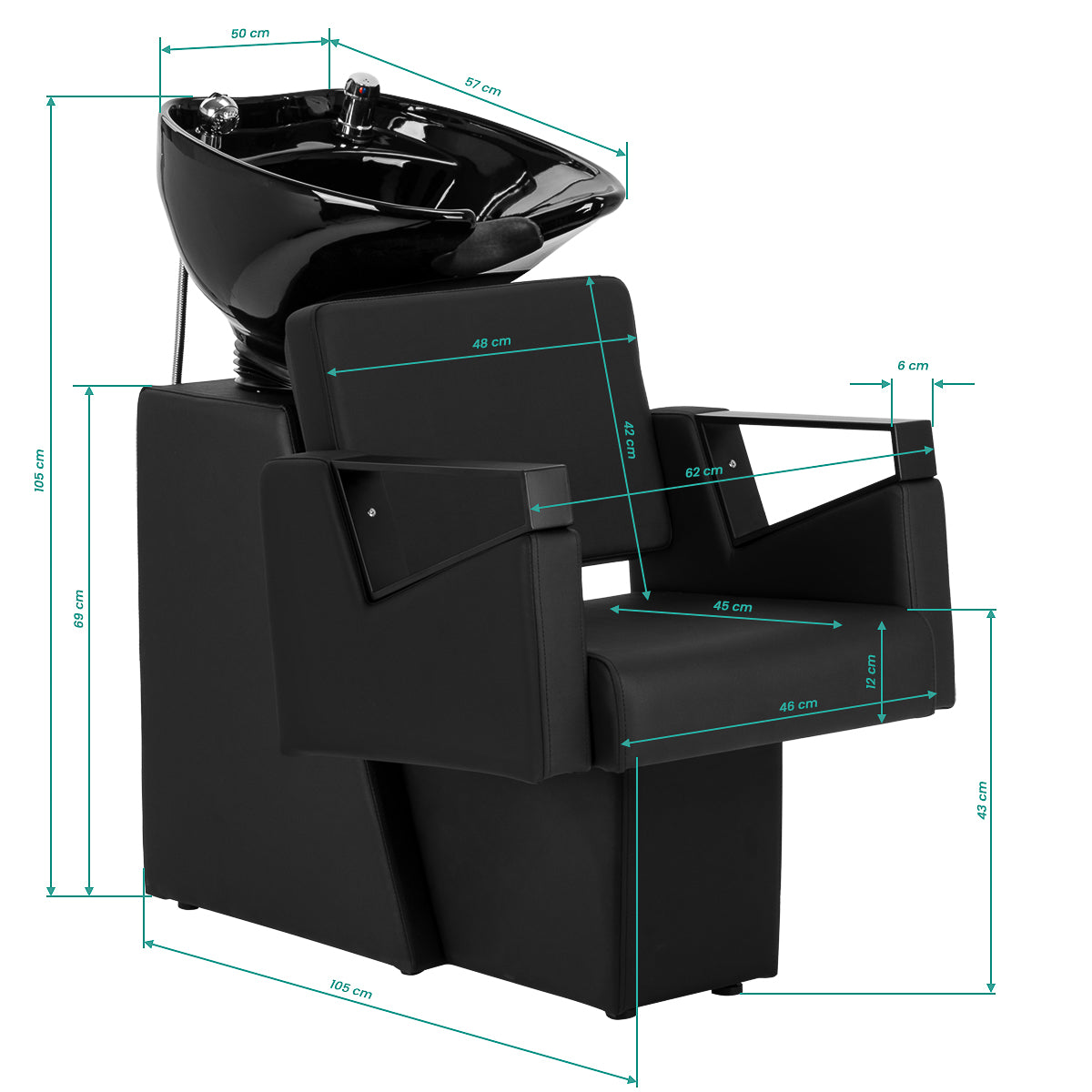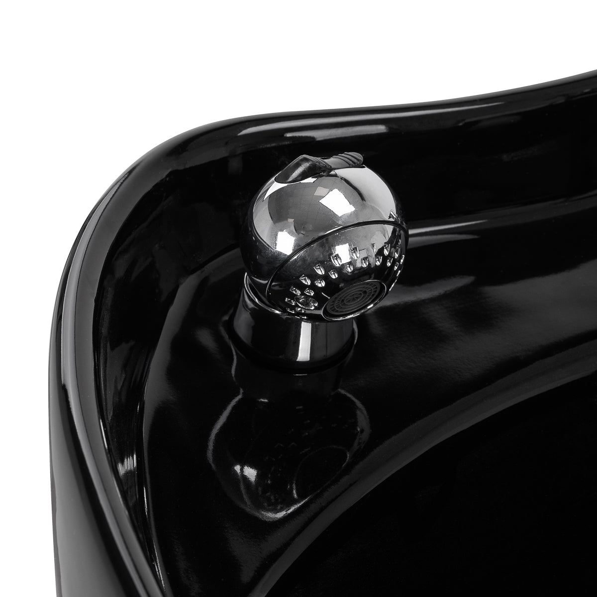 La profondeur soigneusement choisie de la vasque en céramique noire minimise les éclaboussures d’eau et de produits, garantissant une réalisation confortable et efficace de divers soins. Le design réglable permet d’ajuster précisément l’angle de la vasque selon les besoins individuels de l’utilisateur, favorisant une posture ergonomique lors des prestations. La céramique se caractérise par sa durabilité, sa résistance à la décoloration et aux rayures, ainsi que sa facilité de nettoyage. Le rebord ergonomiquement profilé offre un soutien stable et un confort lors du lavage des cheveux, tandis que la housse en plastique confortable élimine la sensation désagréable de froid de la surface en céramique.
