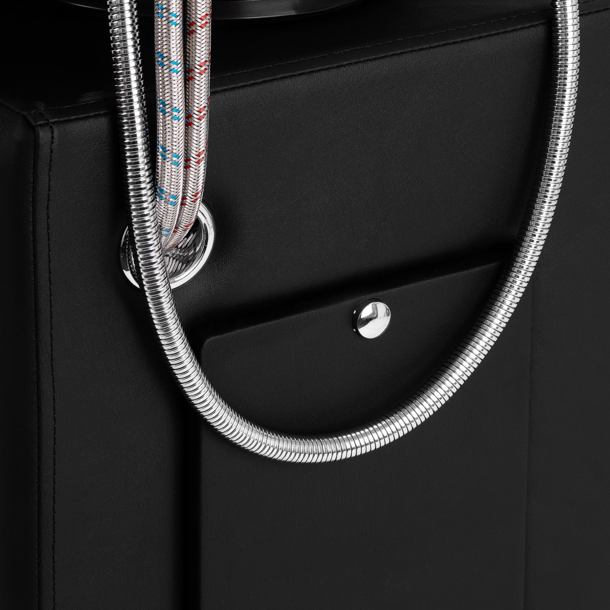 Le fauteuil profilé ergonomiquement avec un rembourrage en mousse durable assure un haut niveau de confort. Le dossier stable garantit un bon soutien du dos et aide à maintenir la posture correcte du client. Les matériaux utilisés se distinguent par leur durabilité et leur facilité d’entretien. Le revêtement en cuir synthétique dans des nuances de noir et les éléments décoratifs noirs lui confèrent une élégance intemporelle. La finition classique garantit que l’unité de lavage s’intègre dans tout style d’intérieur, mettant en valeur le style professionnel du salon. Le set comprend un ensemble complet d’accessoires, comprenant un robinet, une douchette et des tuyaux dédiés, assurant que la station est entièrement prête à l’emploi.