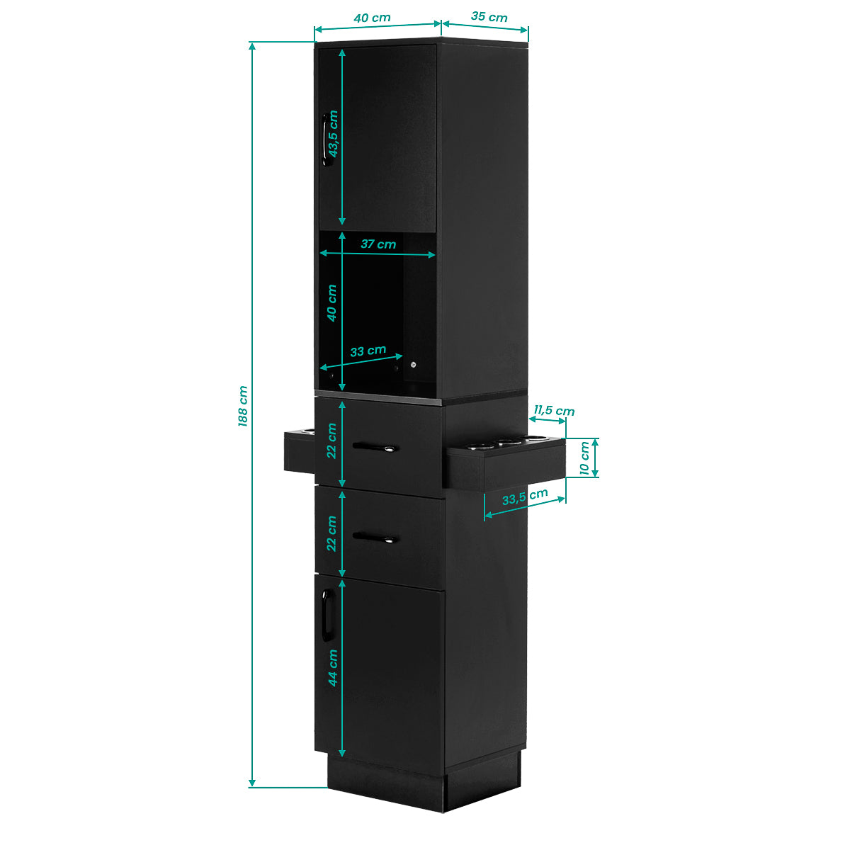 Le design de la station a été développé pour faciliter le travail quotidien du coiffeur et garantir un accès pratique aux accessoires essentiels. Les placards et tiroirs verrouillables aident à maintenir une apparence soignée, tandis que l’espace central ouvert offre un accès rapide aux accessoires les plus utilisés. Les étagères latérales augmentent la surface de travail, permettant un rangement pratique des outils utilisés lors du coiffage.