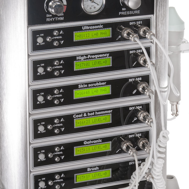 6. D'arsonval / Haute Fréquence / électrothérapie - permet de réaliser des électromassages en utilisant les soi-disant courants d'Arsonval. L'étincelage qui se produit au contact de l'électrode en verre avec la peau a un effet stimulant influence la peau et les tissus sous-cutanés, les muscles ainsi que, indirectement, les organes internes. L'ozone produit pendant le traitement a une action bactéricide. Les charges électriques provoquent la dilatation des vaisseaux sanguins de la peau, accélèrent le métabolisme, augmentent l'absorption des substances nutritives et thérapeutiques contenues dans les préparations cosmétiques.
