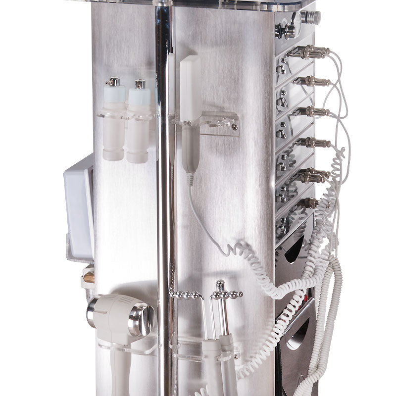 10. Vapozone, ozone, aromathérapie - hydrate la peau à l'aide de vapeur, adoucit la peau, ouvre les pores, détend les muscles du visage, ce qui facilite le traitement de nettoyage ainsi que prépare la peau pour les traitements suivants. Permet l'utilisation de l'aromathérapie et phytothérapie. L'ozone supplémentaire agit comme un bactéricide.