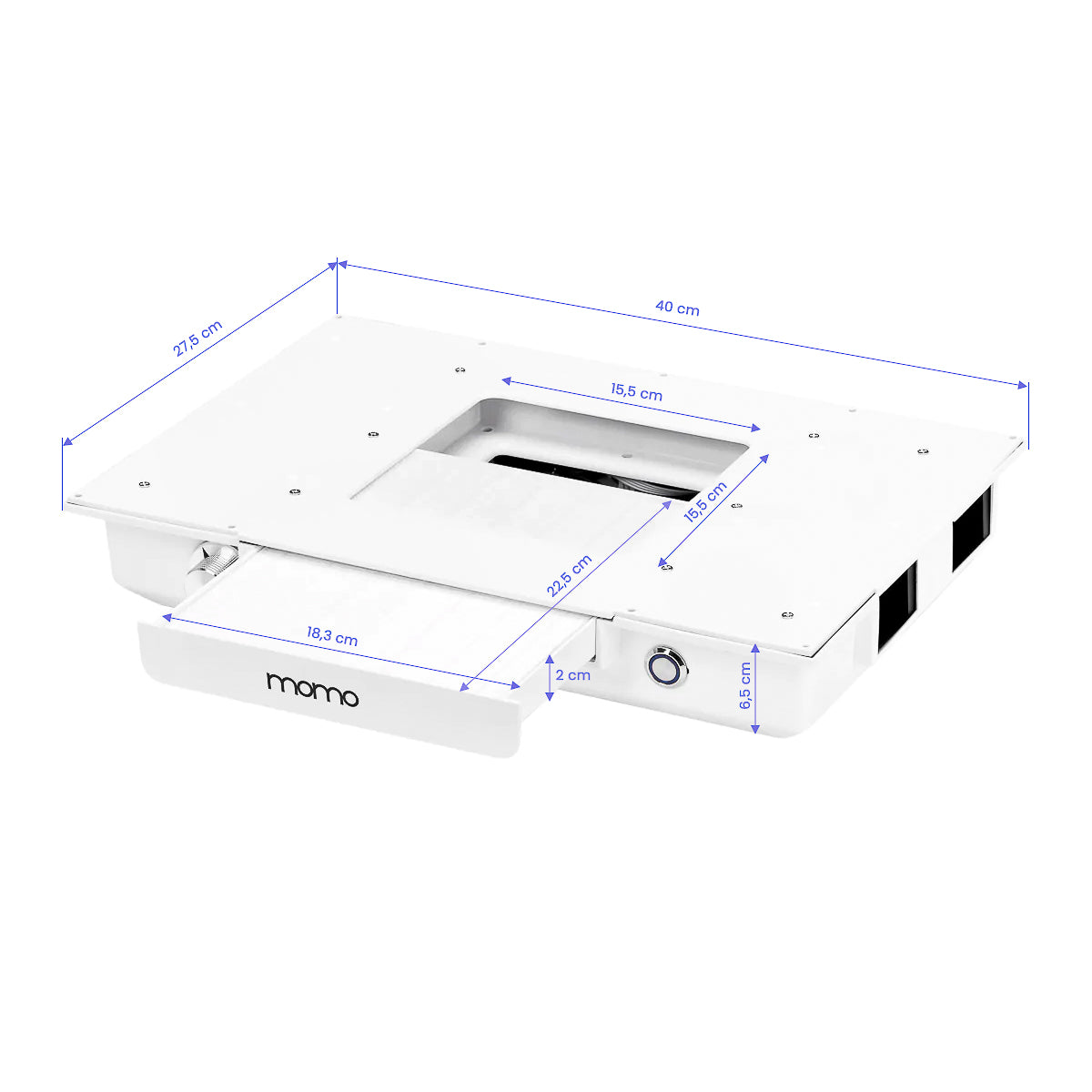 Le collecteur de poussière à cassette Momo J-02 intégré au plan de travail améliore considérablement le confort et l'hygiène du travail, éliminant efficacement la poussière générée lors des soins de beauté, tels que les manucures. Grâce à cet appareil, l'air du salon reste propre et le poste de travail exempt de pollution, ce qui augmente la sécurité à la fois de l'esthéticienne et des clients. Le collecteur de poussière est facile à utiliser et à entretenir, ce qui renforce encore sa fonctionnalité. Un nettoyage régulier et le remplacement des filtres assurent une efficacité d'absorption constamment élevée. Il est possible d'acheter des filtres de rechange supplémentaires (SKU 123581).