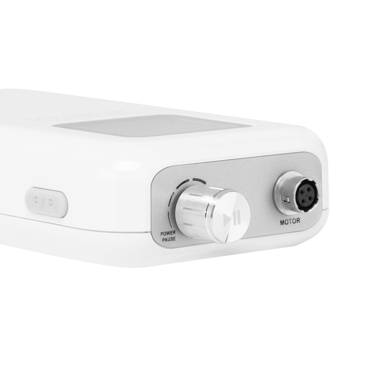 Le bouton permet un réglage progressif de la vitesse de la tête, atteignant jusqu'à 35 000 tours par minute, permettant une personnalisation facile et un confort lors de différents traitements. En appuyant sur le bouton, vous pouvez immédiatement arrêter et reprendre l'appareil (fonction pause), ce qui vous donne un contrôle total sur le flux de travail. Les boutons pratiques situés sur les côtés permettent un changement rapide vers la commande au pied et la modification du sens de rotation, ce qui facilite encore l'adaptation de l'appareil à divers services. L'écran affiche des informations sur le sens de rotation, l'état de la batterie, l'activation de la commande au pied et la pause active. De plus, l'appareil est équipé d'une protection contre la surcharge, qui protège le moteur de la surchauffe, garantissant une plus grande sécurité de travail et une longévité de l'équipement.