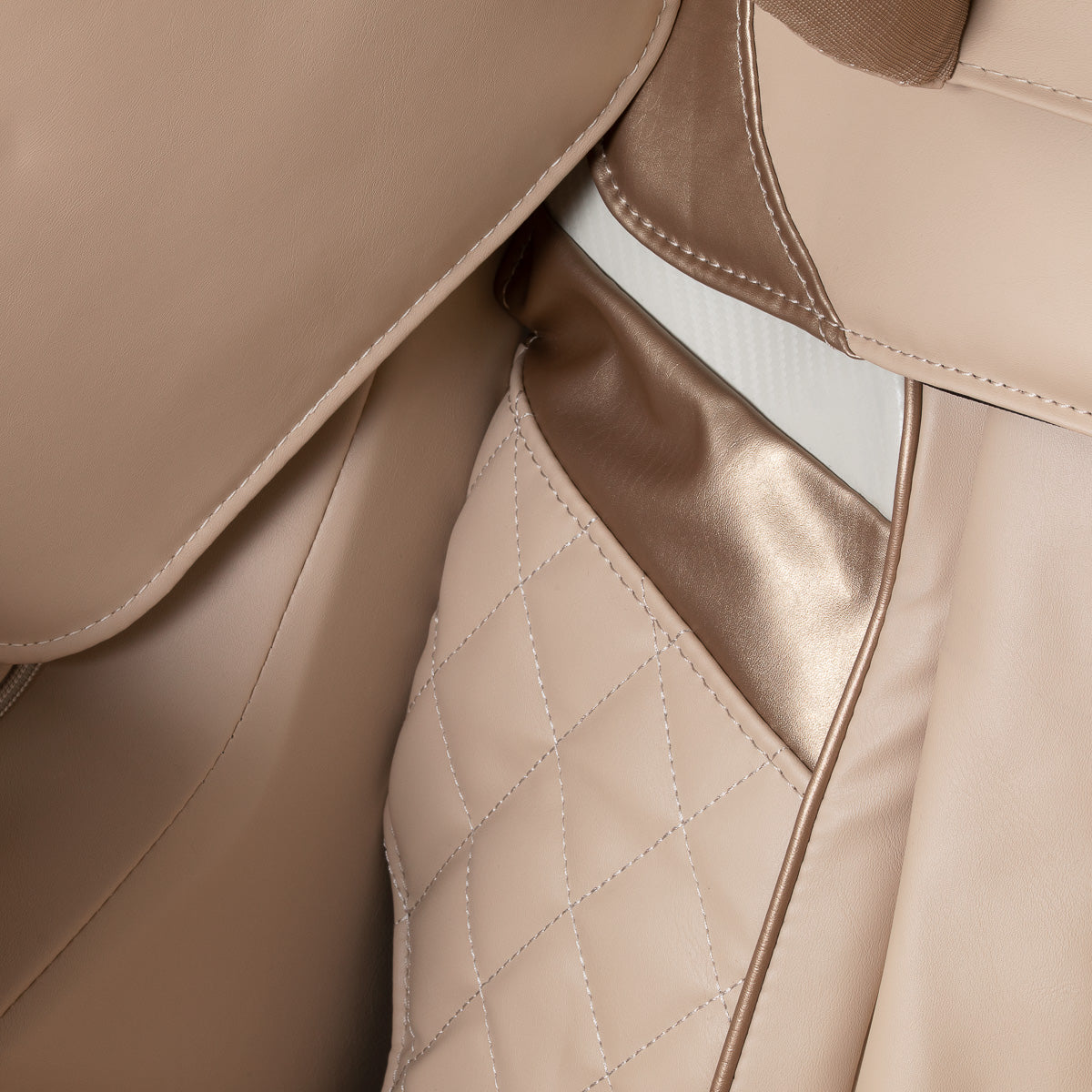 Le simili cuir doux dans des tons beige offre un confort d’utilisation exceptionnel et une facilité de nettoyage. Ce matériau est non seulement esthétique, mais aussi résistant à l’humidité, ce qui augmente sa fonctionnalité. Les éléments extérieurs en or rose combinés à une finition structurée dans des tons blancs donnent au fauteuil un aspect moderne et élégant. La forme compacte et les couleurs sobres permettent au modèle de s’intégrer harmonieusement dans divers styles d’intérieur. Sakura Prime 108 est un excellent choix pour les personnes recherchant une relaxation quotidienne – surtout après une journée intense ou un effort physique exigeant.