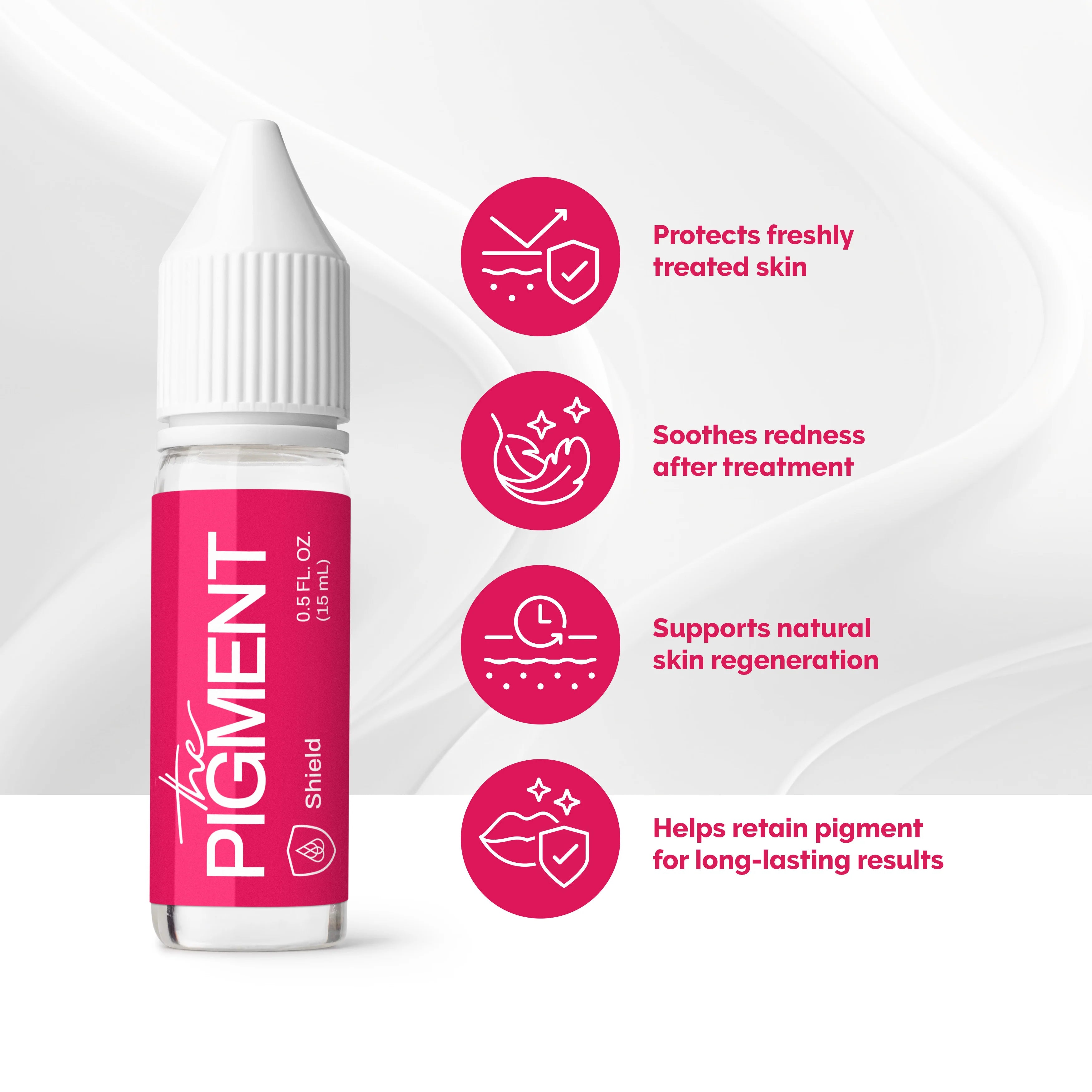 The Pigment Shield 15ml est spécialement formulé pour les soins après les procédures de PMU et de microblading. Sa texture riche et transparente crée un film protecteur sur la zone traitée, protégeant le pigment fraîchement implanté. La formule aide également à apaiser les rougeurs et soutient le processus naturel de régénération de la peau.